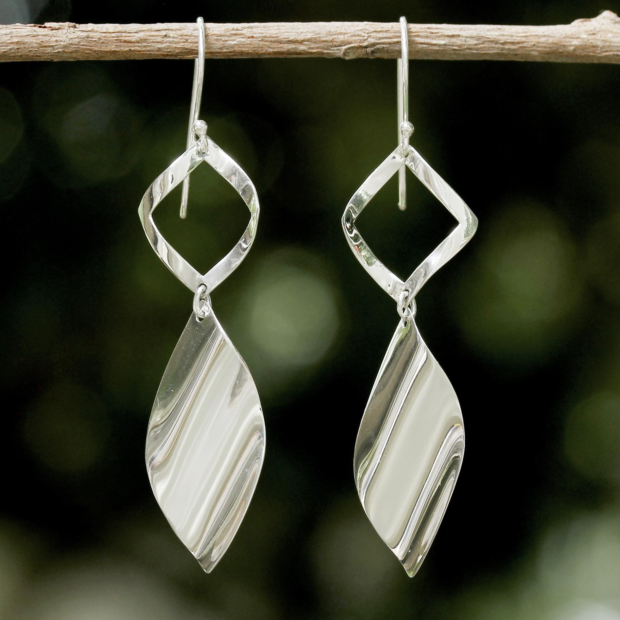Shimmering shapes twist like helicopter leaves falling from a maple tree. Working in sterling silver, Thailand's Lalana captures the fleeting elegance of nature, crafting this elegant pair of modern dangle earrings.