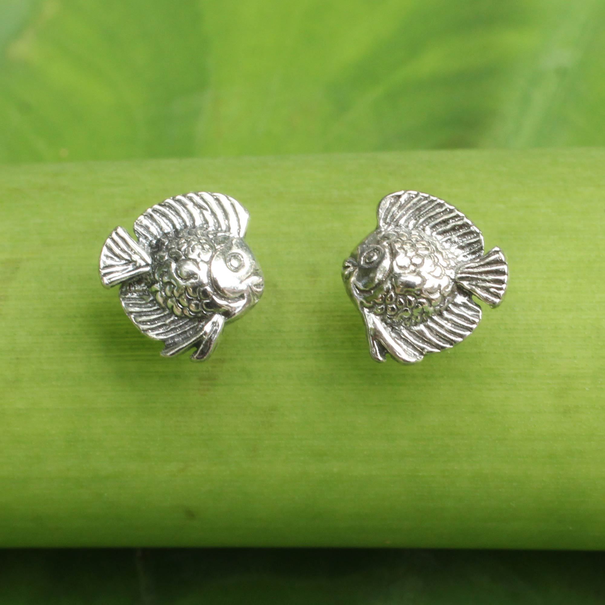 Two adorable fish swim happily along in these petite button earrings from Thai artisan Wadarat Supasirisuk. The artisan crafts the earrings from sterling silver, delineating each scale and fin with care and precision.