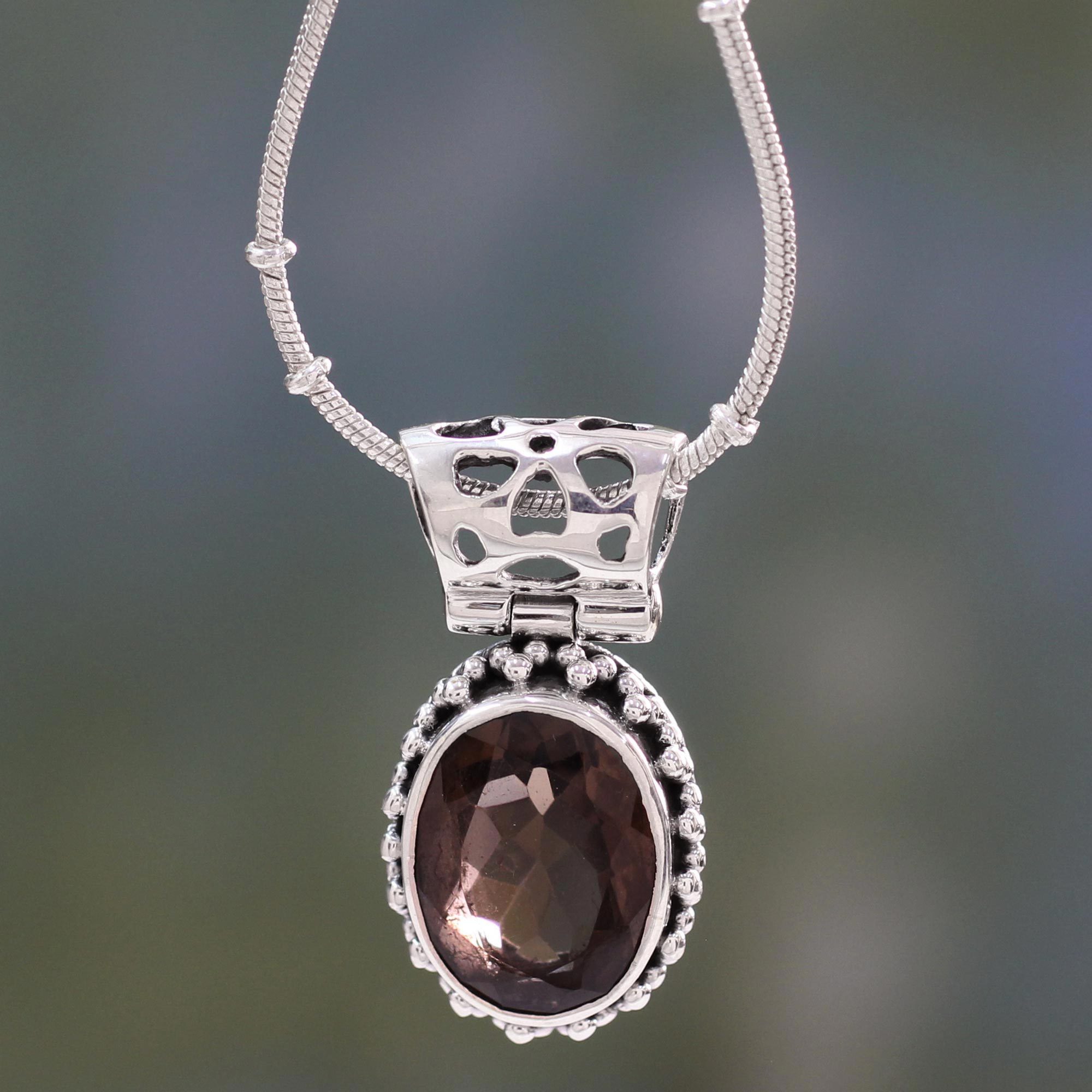 Smokey Quartz and Sterling Silver Pendant Necklace, 'Smoking Gaze'