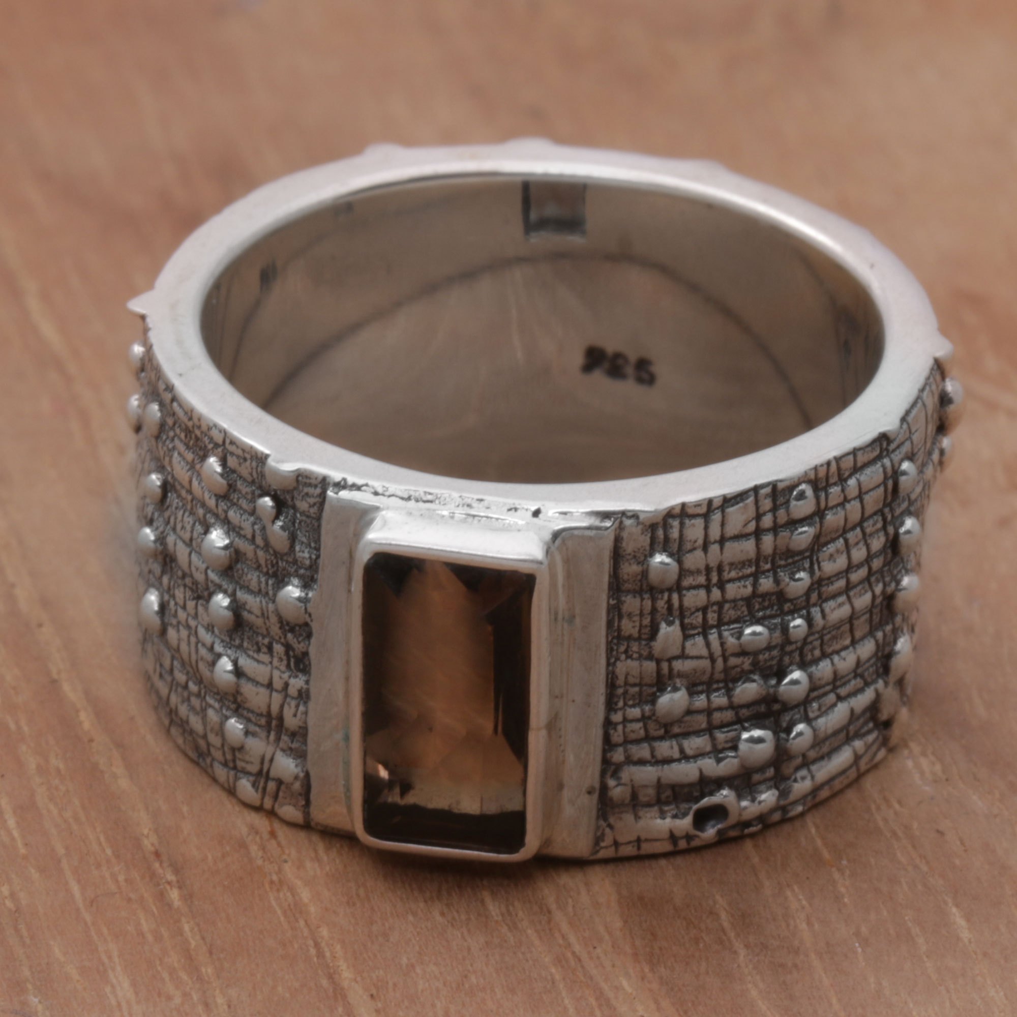 A dotted, etched band with a striking contrast of finishes circles the finger with a fashionable elegance, handcrafted of sterling silver by Indian artisan Cahya Krisna. At the front of the ring rests a rectangular stone of smoky quartz weighing over one carat.