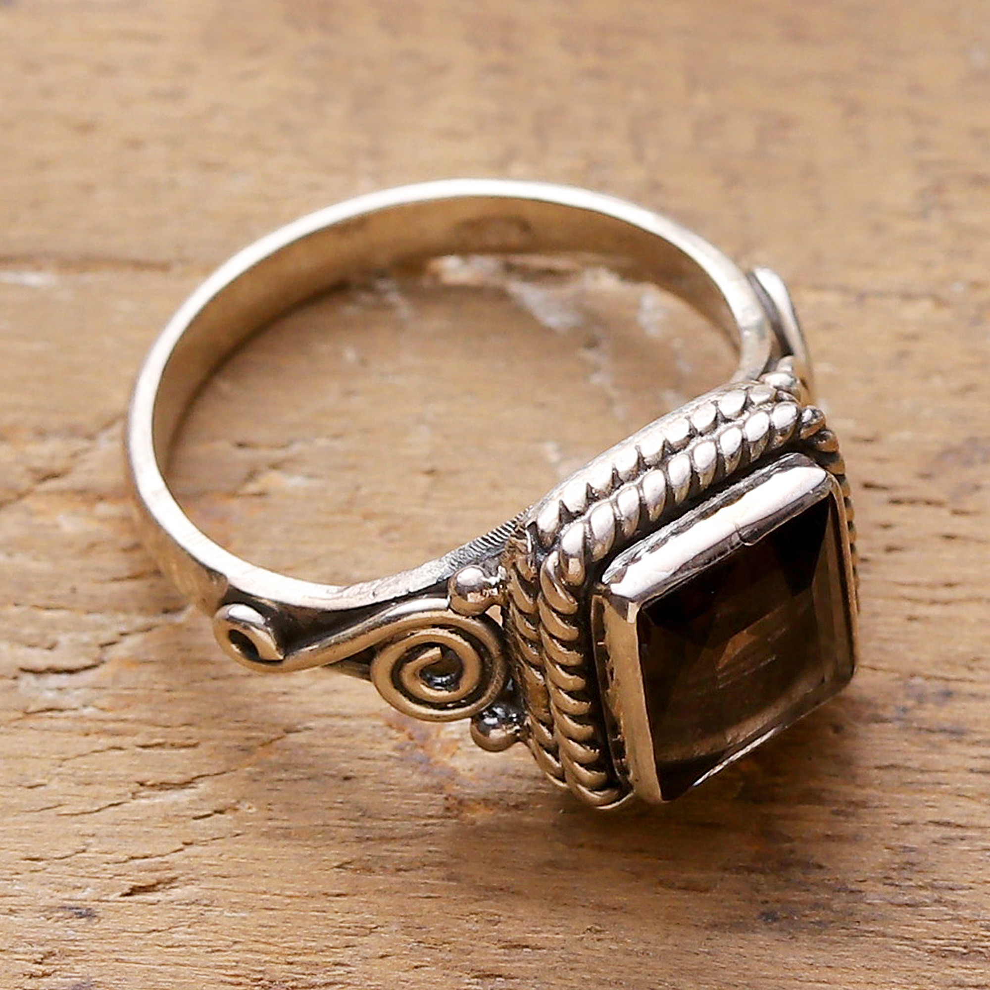 Aparna of India presents this hauntingly romantic cocktail ring. The sterling silver band features a dreamy spiral motif leading up to a 1.5 carat faceted smoky quartz. Surrounded by an exceptional roping design, the smoky quartz exudes a quiet, mysterious allure sure to draw interest and admiration.