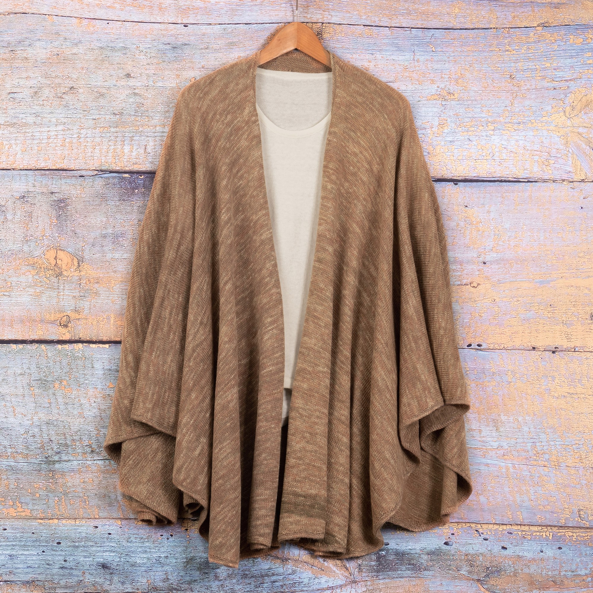 Made with a soft blend of alpaca, wool and acrylic yarns, this timeless ruana evokes the serene beauty of the Andean mountains in the elegant beige and pink palette. Peruvian artisan Alfredo Falcon shows the beauty of the region's textiles in this versatile garment.