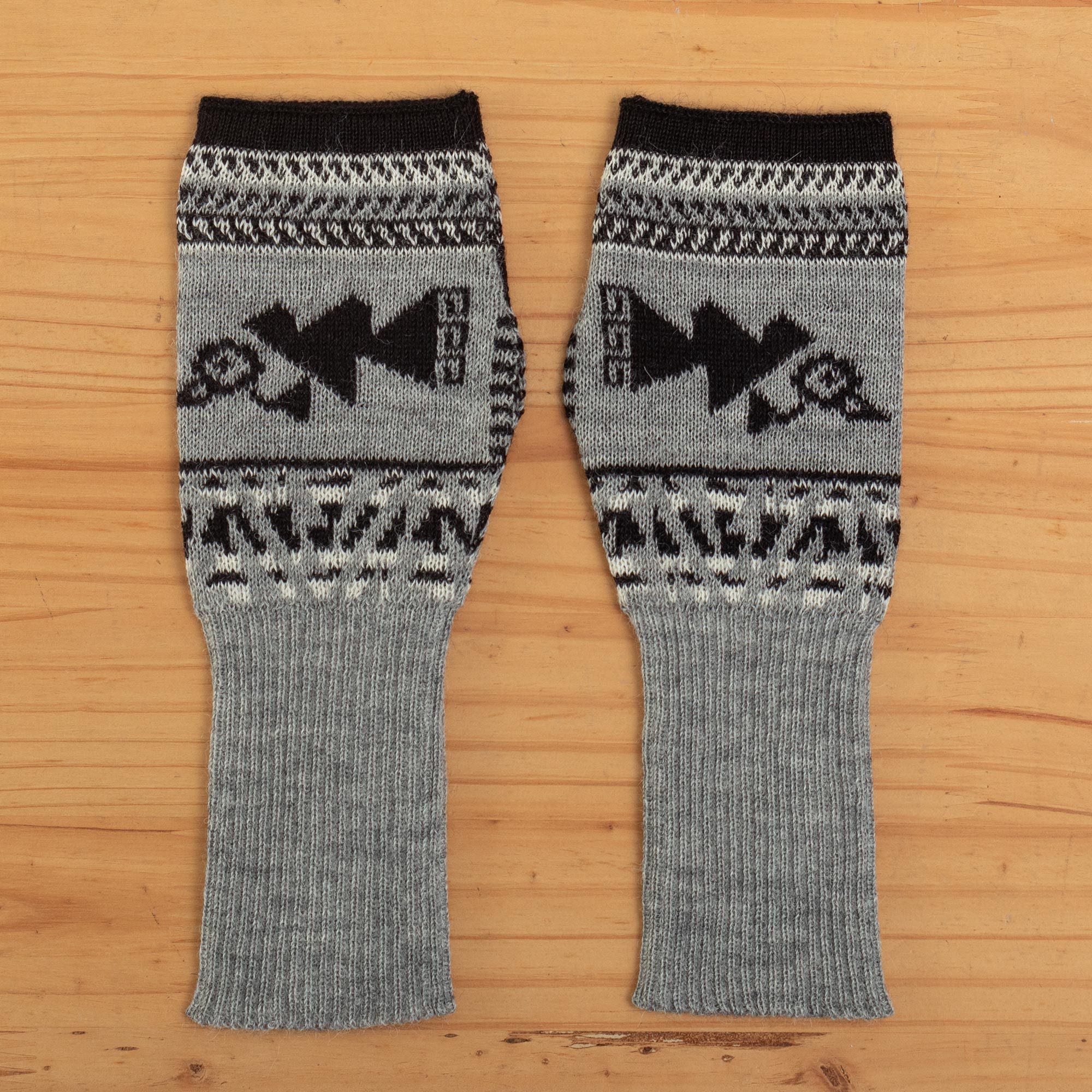 Soft Fingerless Mitts in 100% Baby Alpaca from Peru, 'Chancay Icons in Grey'