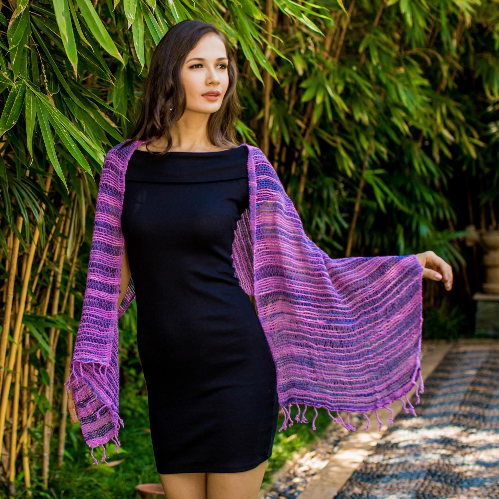 Vinita in Thailand creates a breezy cotton scarf in a pretty melange of lilacs and dusky blue shades. The open-weave scarf is made from hand-spun cotton yarns of irregular widths for a nubby texture.