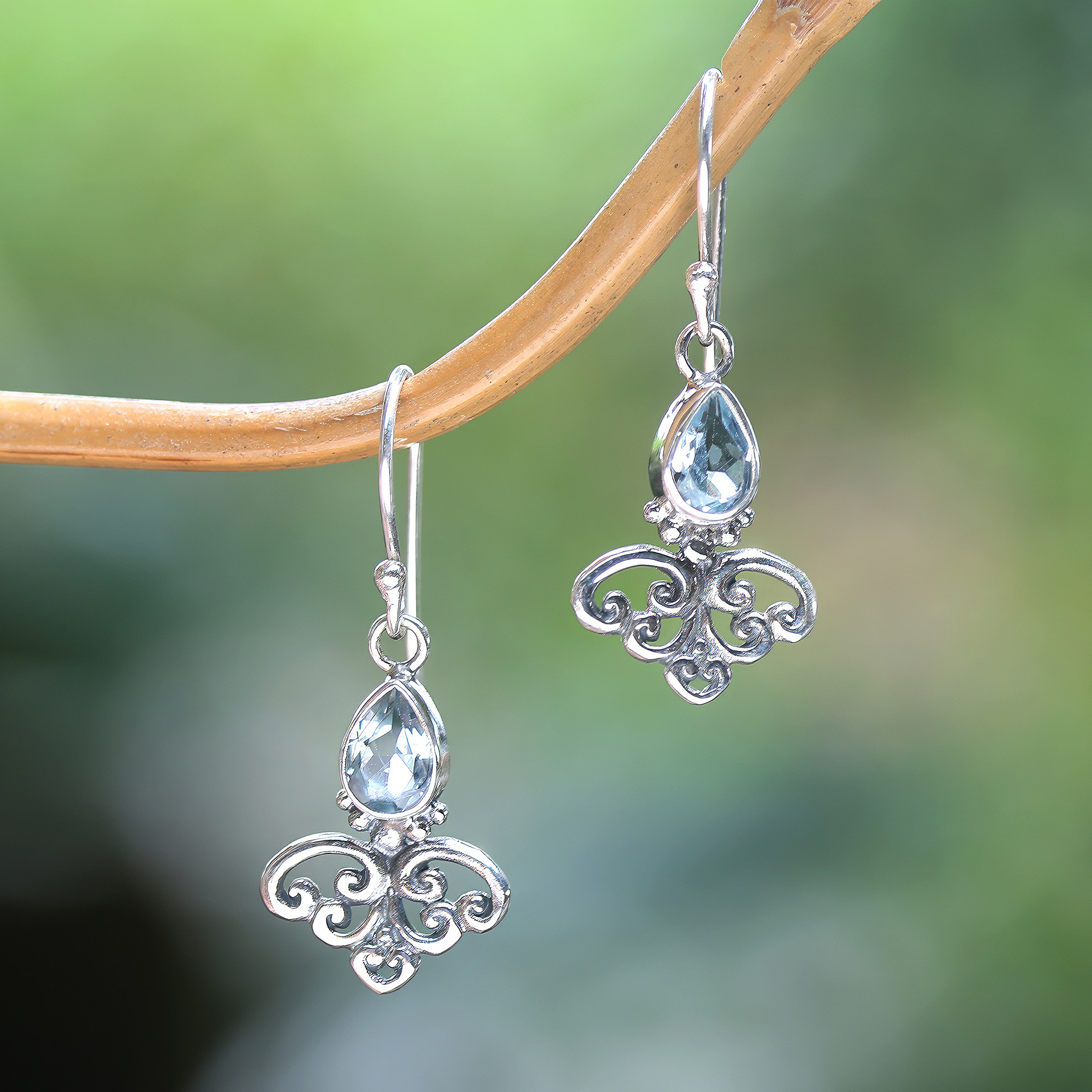 The lucky spade suit transforms into a charming design of ethereal allure. Balinese artisan Nyoman Rena works with sterling silver to create these dangle earrings formed by enchanting vines that gracefully embrace blue topaz stones in a pear shape, totaling over two carats.