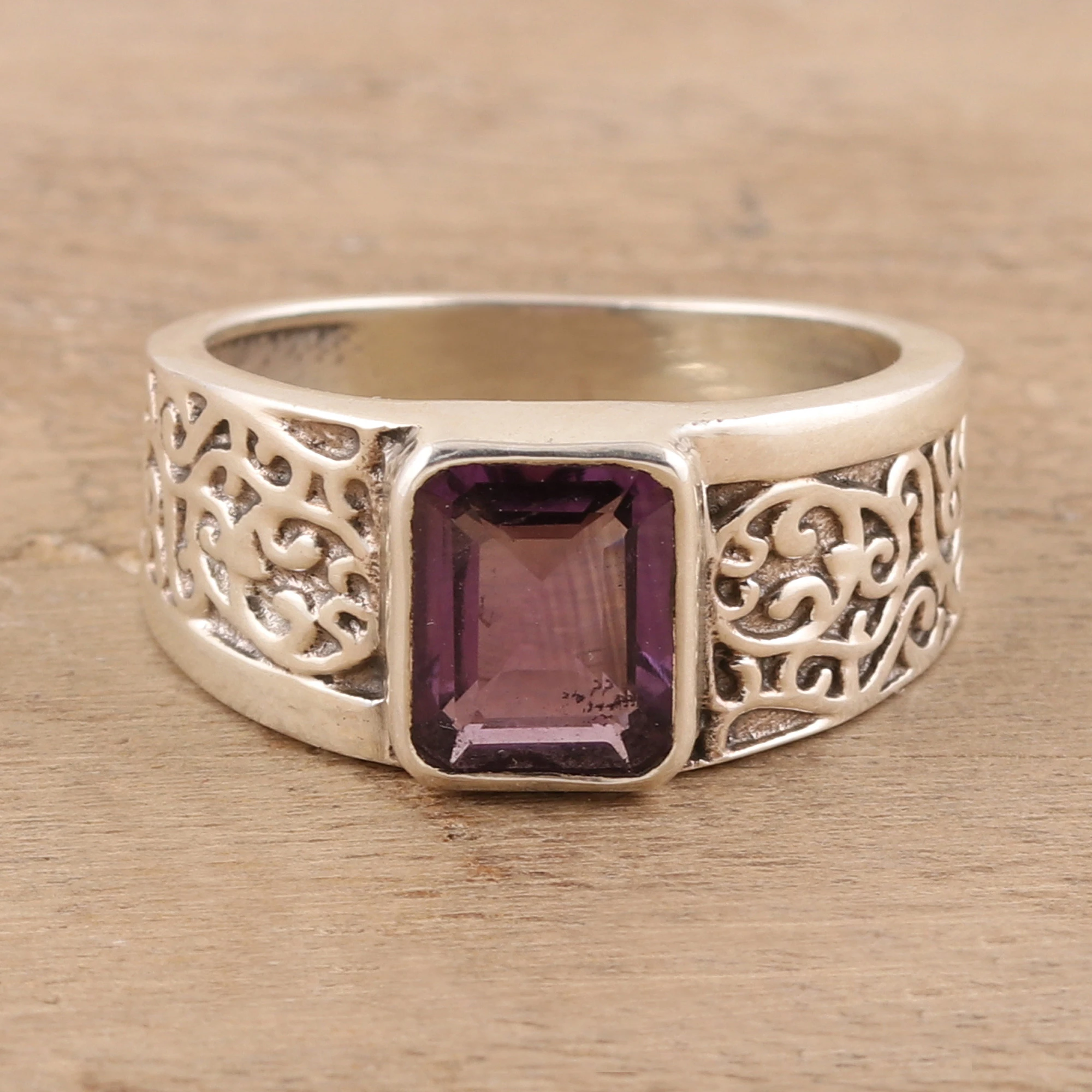 Centered by a one-carat gemstone of faceted amethyst, this ring is presented by Parul in India. Local artisans create the striking ring, circling the finger with a band of sterling silver that is decorated by vine patterns.
