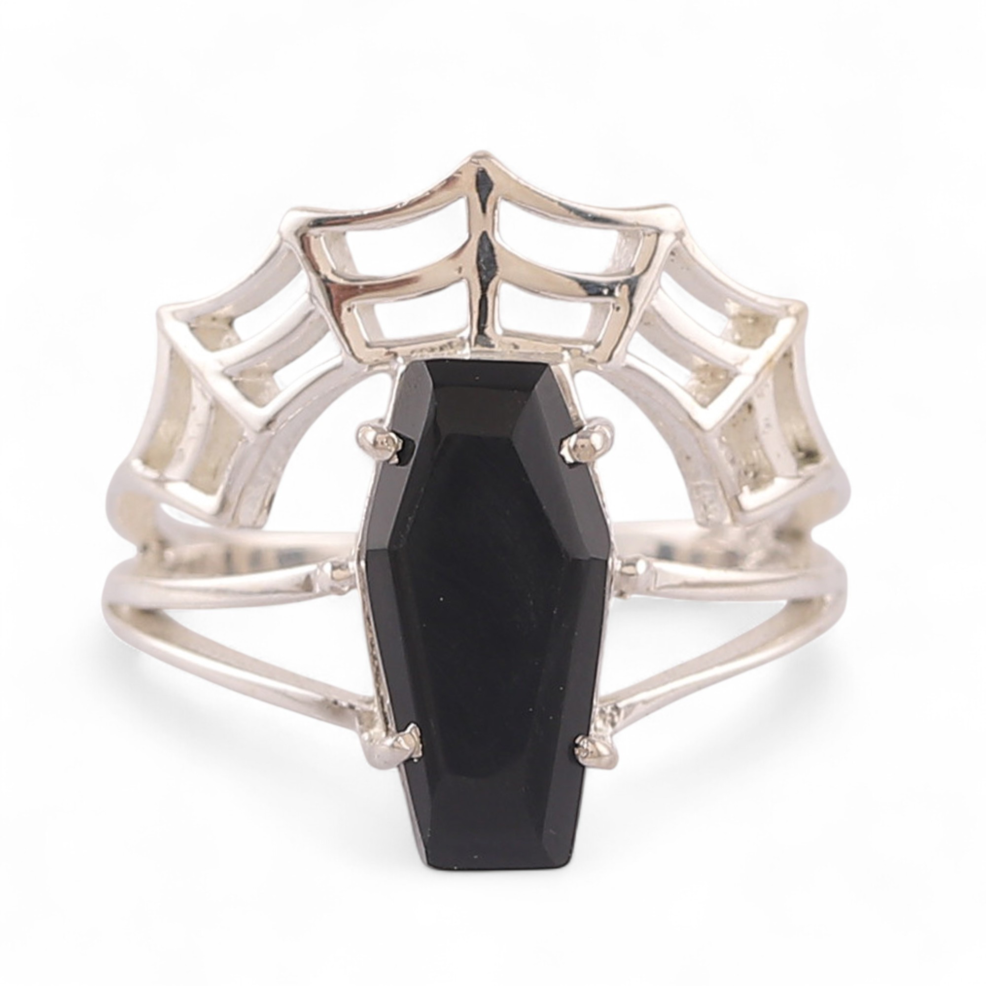 An intricate spiderweb motif crowns a rectangular black onyx stone in this sterling silver cocktail ring that catches the eye. The bold motif guarantees this design presented by India's Chintan will turn heads and infuse your style with a unique charm.