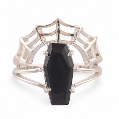 Spiderweb Halloween-Themed Black Onyx Silver Cocktail Ring, 'Web of Mystery'
