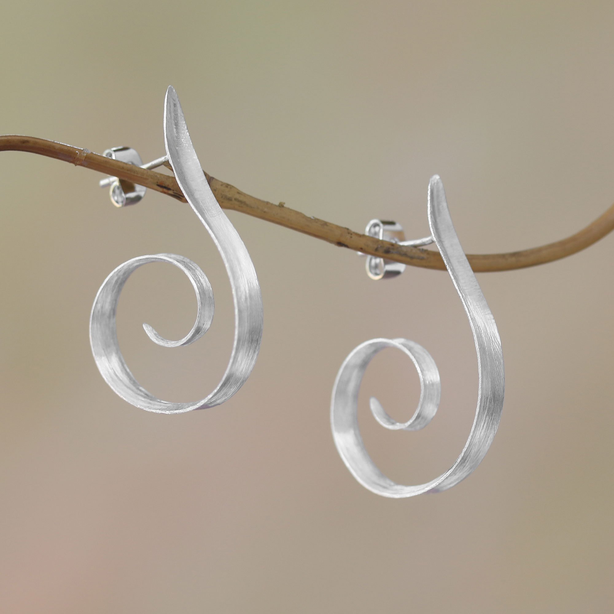 Curling below the ears, spiral shapes are handcrafted of sterling silver in this pair of half-hoop earrings from Bali. Desi Antari designs these awe-inspiring earrings, which are accentuated by a brushed-satin finish.