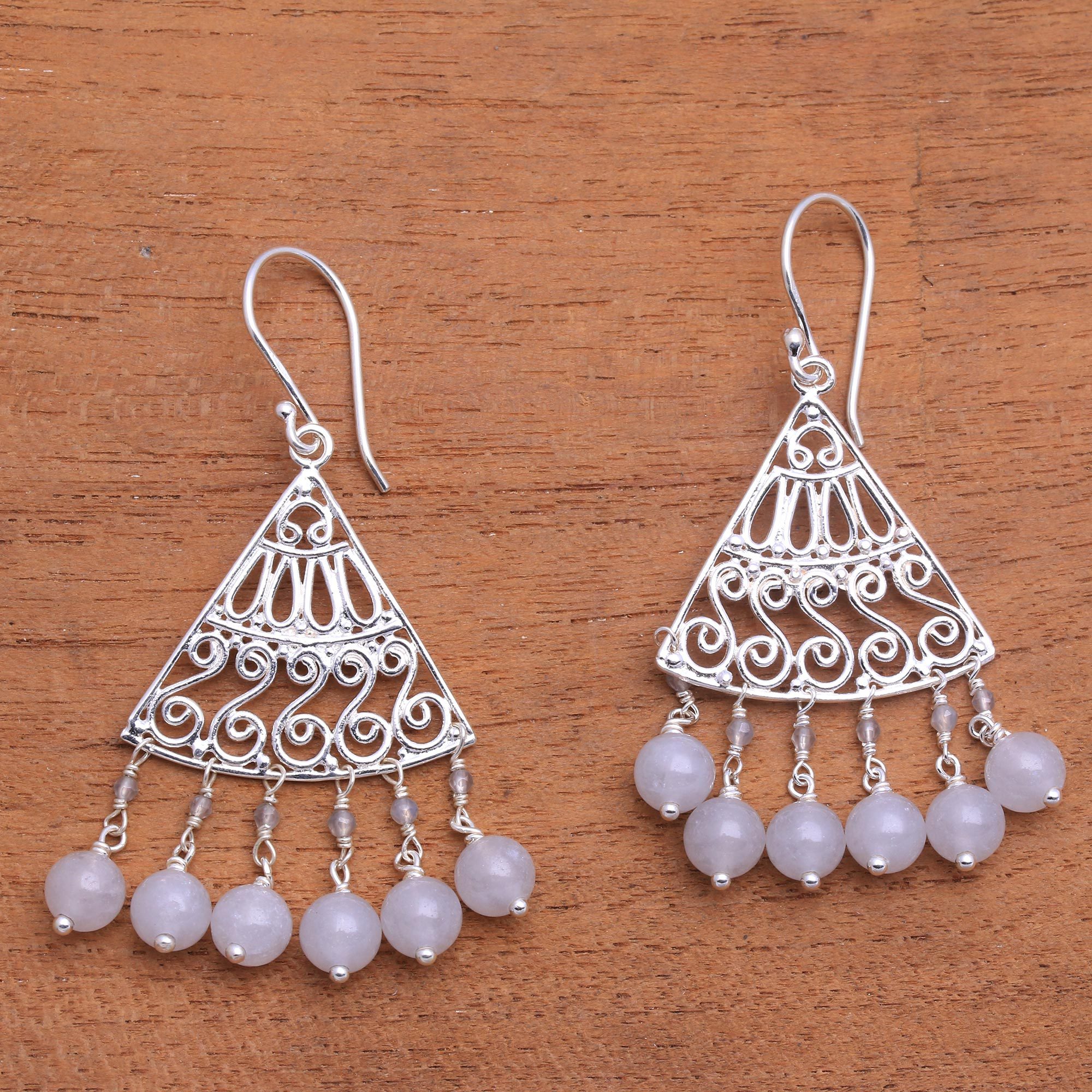 Gleaming beautifully, a chandelier of moonstone beads dangles from these Balinese earrings. Ketut Sulastri works with sterling silver, crafting each earring in a triangular fan shape to display spirals and intricate openwork.