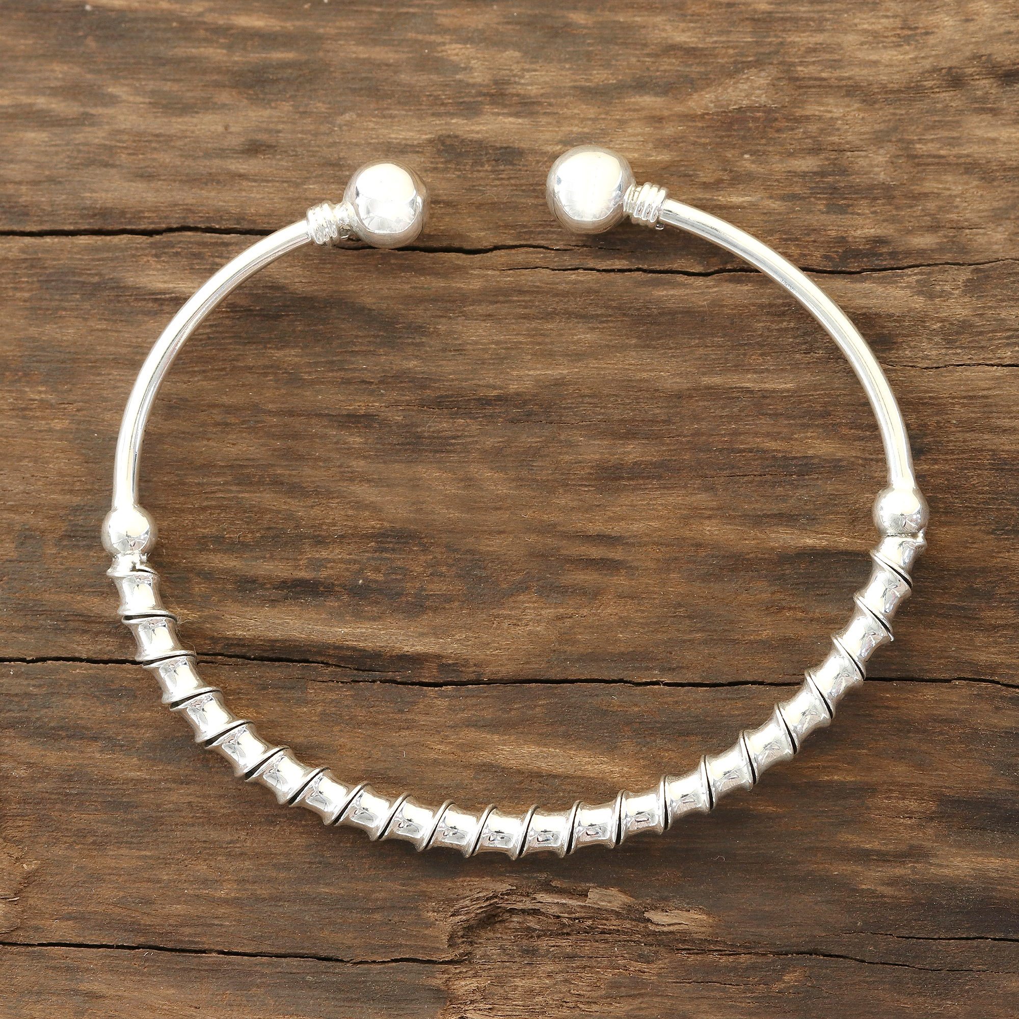 Featuring fascinating spiral patterns, this sterling silver cuff bracelet is designed by Shivani Choudhary. Indian artisans craft this majestic bracelet, which is capped with baubles at the ends.