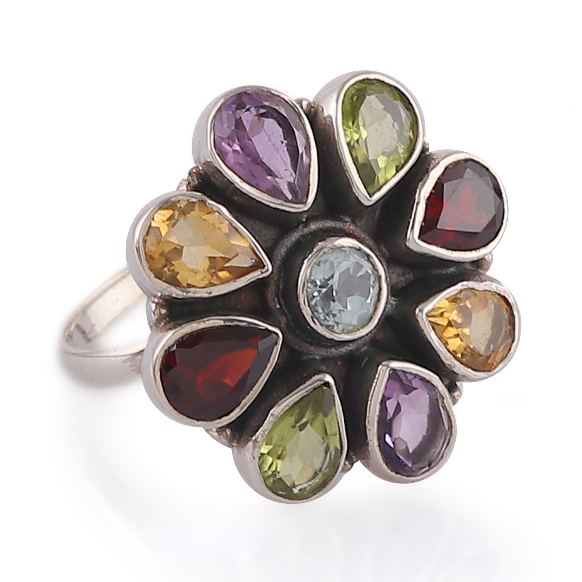 Gemstones add a petal to this lovely bloom from Indian lands. Neeru Goel and a team of talented artisans present this sterling silver cocktail ring, whose bloom shape is completed with polished and oxidized finishes. Then, a combination of garnet, amethyst, peridot, citrine and blue topaz jewels add color to each petal, totaling over six carats.