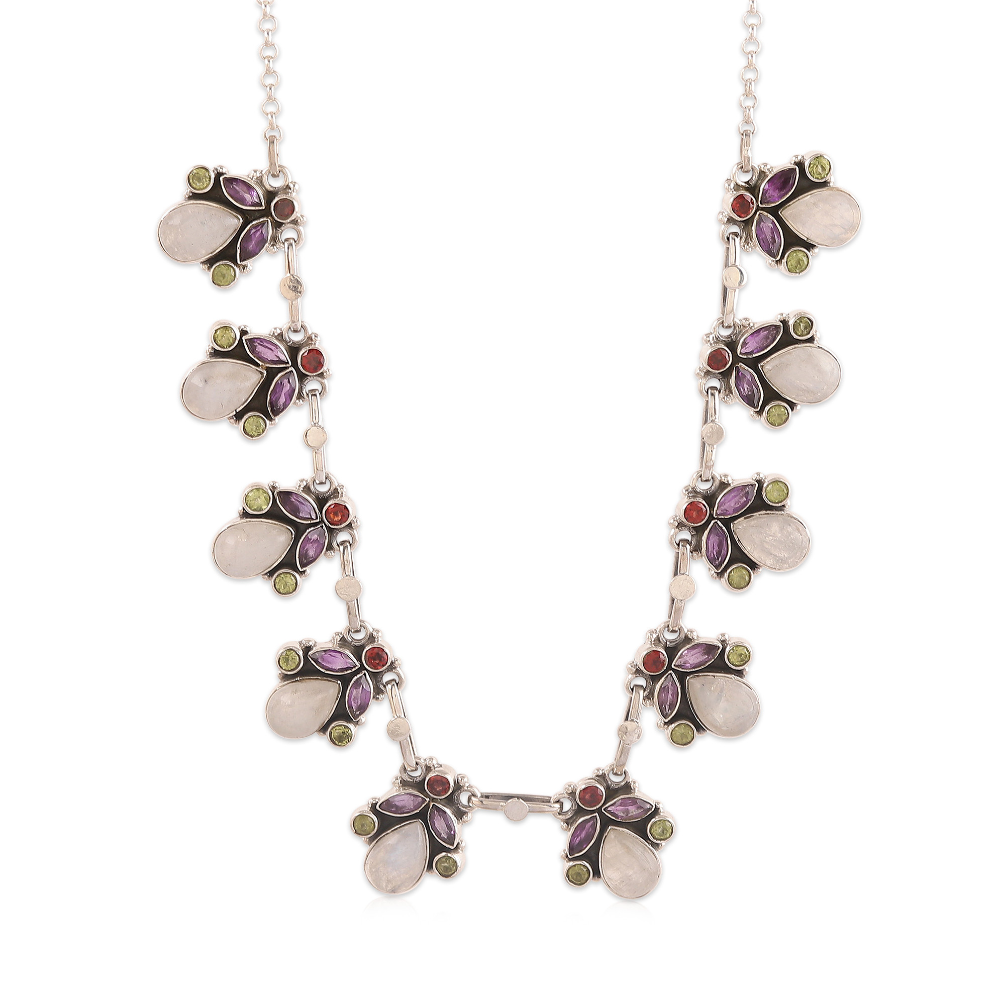 Precious blooms grow around a design from Indian lands. Neeru Goel of India presents this link necklace, crafted from sterling silver. Each bloom charm reunites gemstones of peridot, amethyst, garnet and rainbow moonstone, enriched by a faceted finish and all totaling over eleven carats.