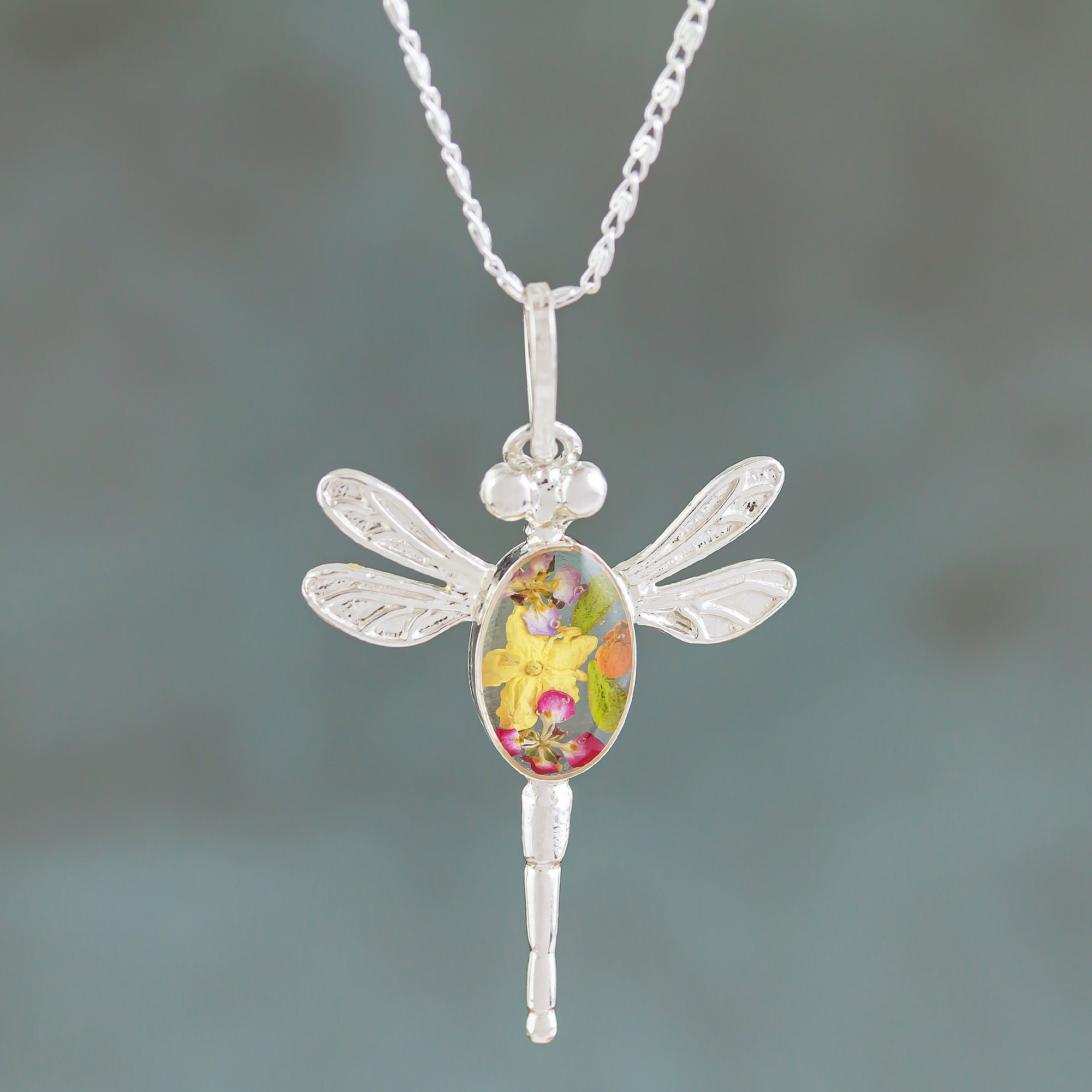 The northeastern edge of the ancient Valley of Anahuac delights the Del Toro Family with an enchanting view of Mother Nature. This sterling silver necklace pays homage to the Valley's dragonflies and summer wild blooms, now immortalized in resin and embraced by high-polished details.