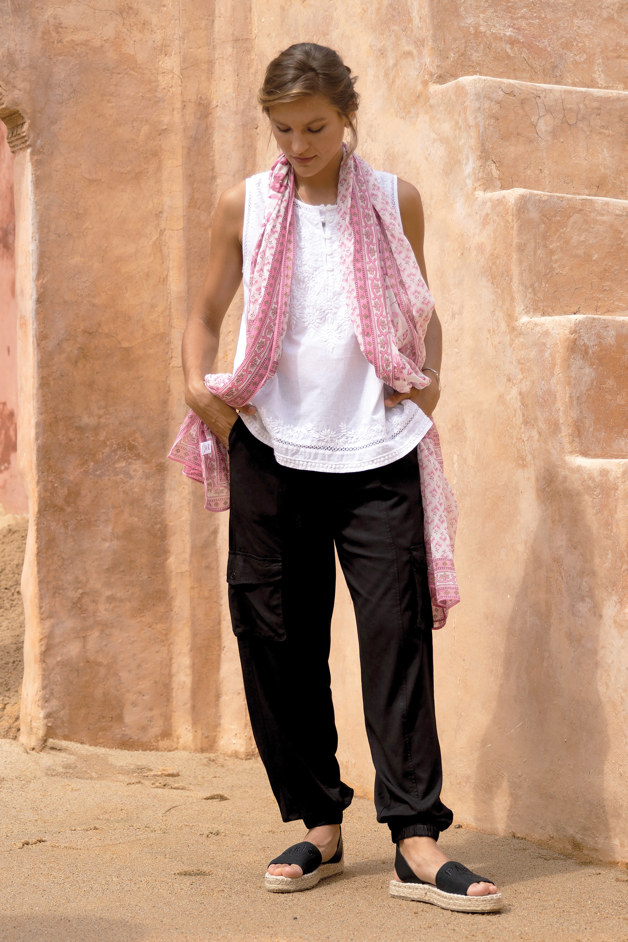 Soft pink shades, reminiscent of spring blossoms, enhance the delicate details on this block printed shawl designed by Dinesh Singh. Woven from lightweight cotton yarns, the generously-sized shawl features various floral patterns created using India's traditional hand-block printing technique, offering a unique and charming design perfect for a multitude of uses.