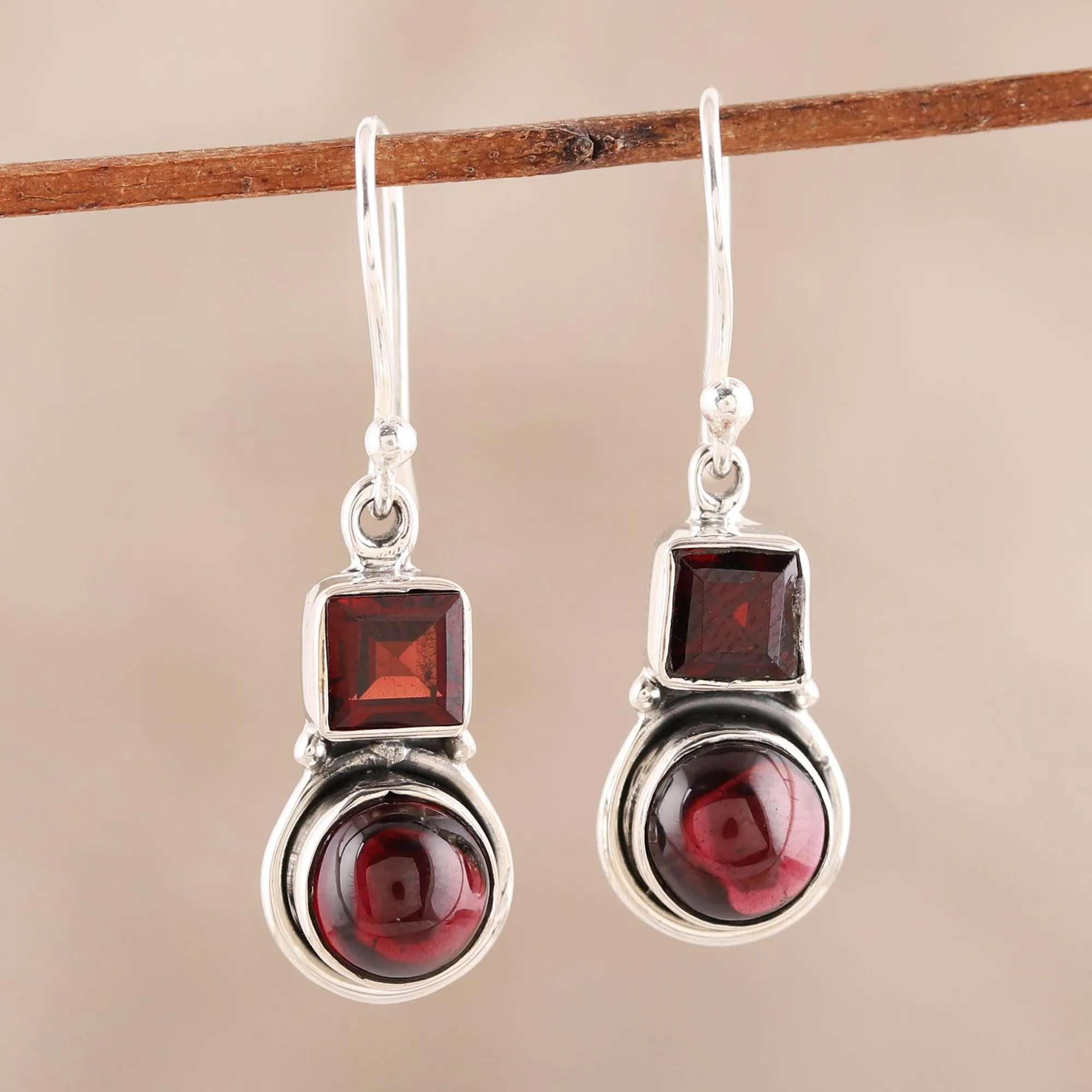 Square and Circular Garnet Dangle Earrings from India, 'Glittering Combo'
