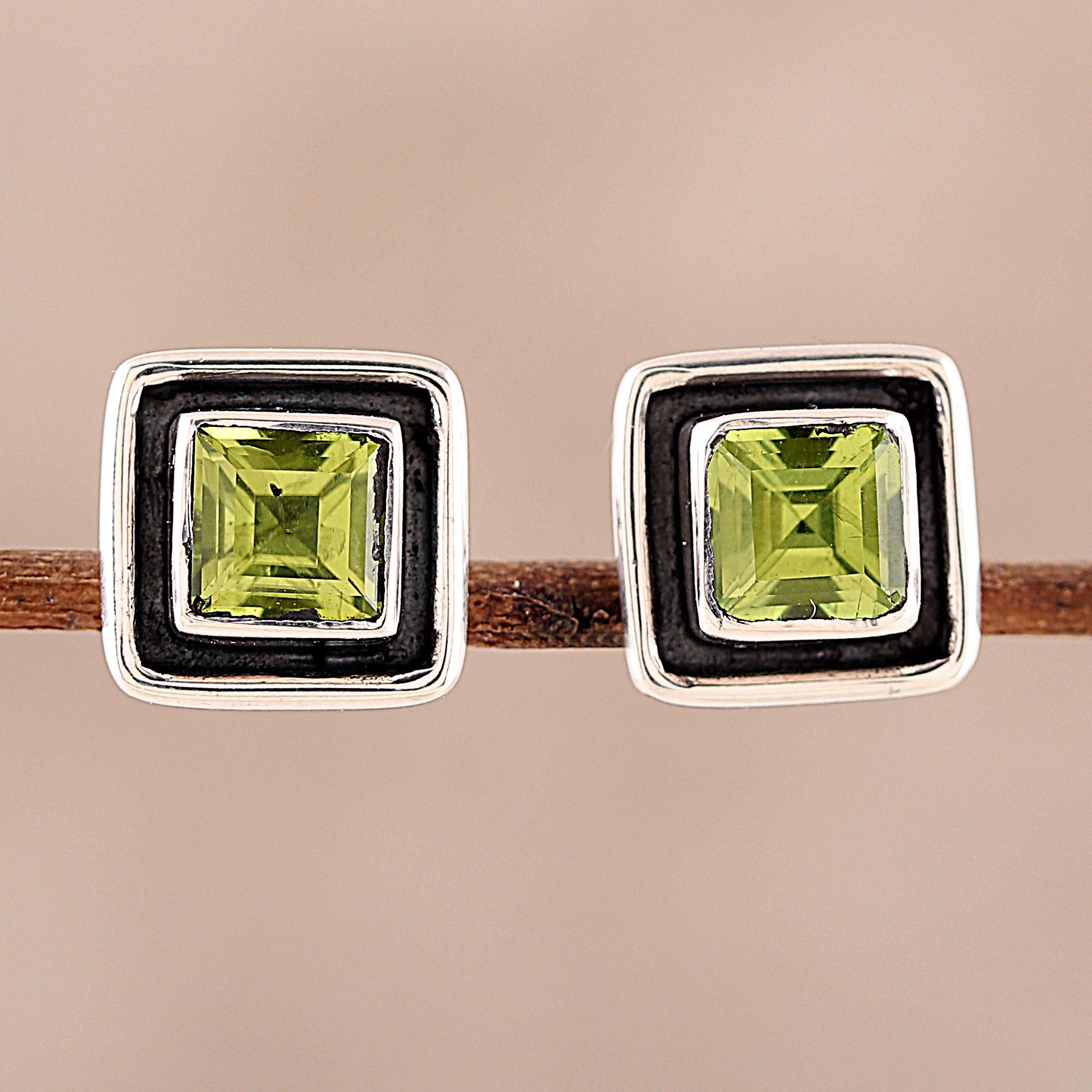 Square Peridot Stud Earrings from India, 'Verdant Frame'