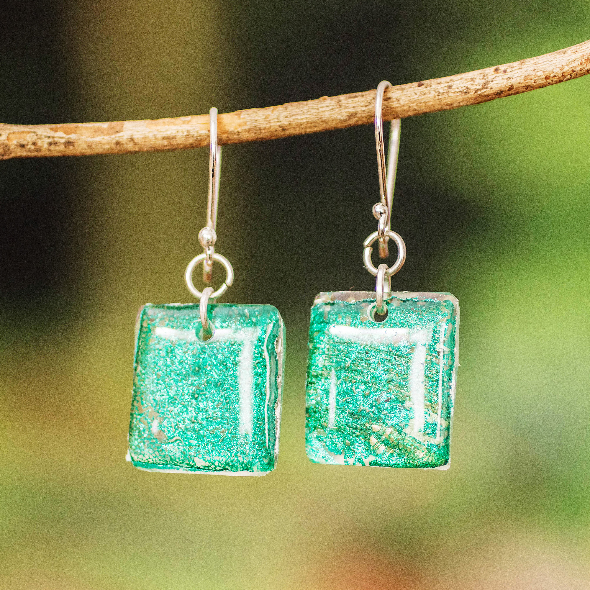 Evoking the beauty of a lake, two squares are crafted from bubbly recycled CDs that are coated in acrylic. Guatemalan artisan Rosario Leiva designs these eco-friendly dangle earrings, which swing from hooks of sterling silver.