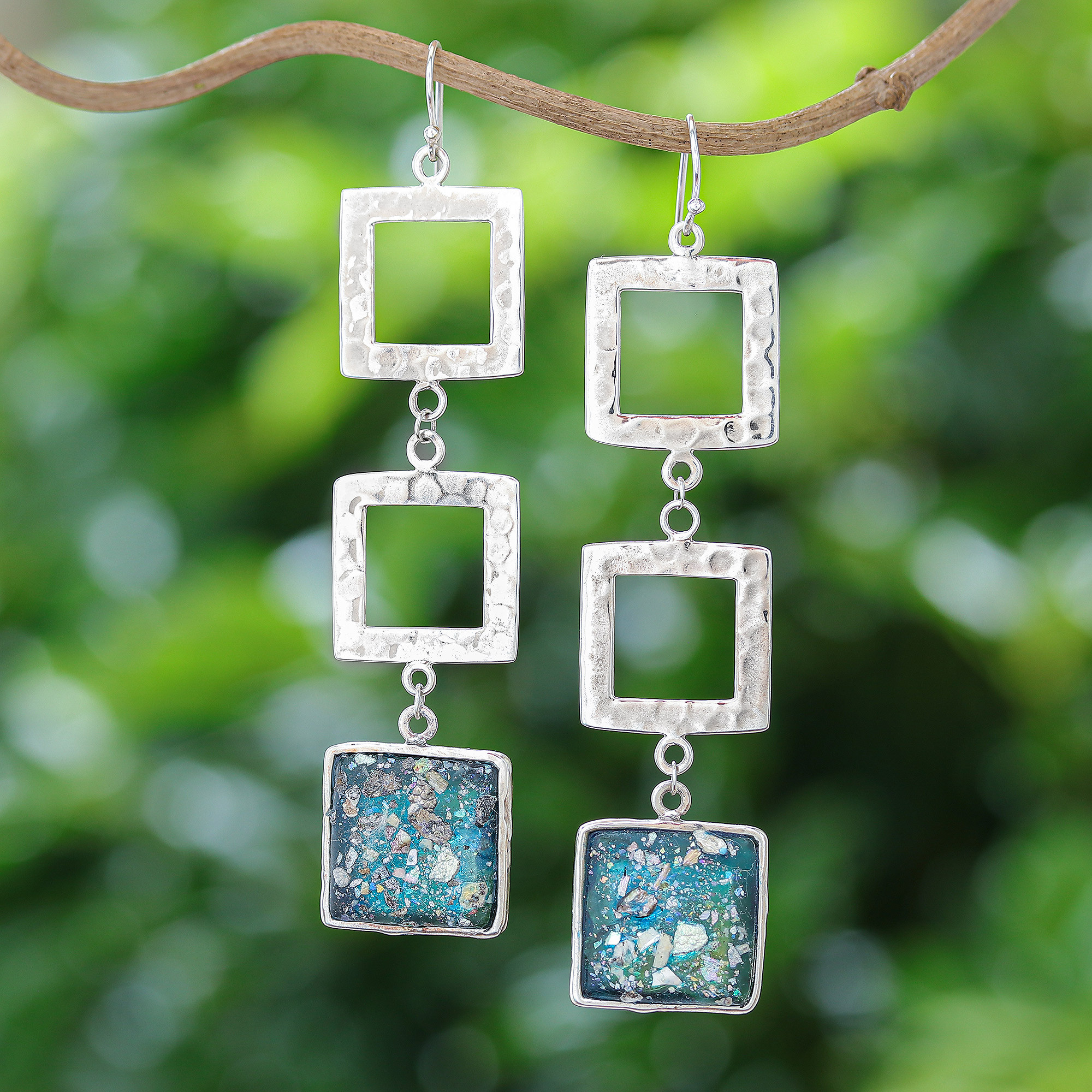 Recovered from dig sites that are thousands of years old, ancient Roman glass displays its beautiful blue hues in this pair of dangle earrings from Thailand. Michael Krainer designs these earrings, crafted with squares of sterling silver.