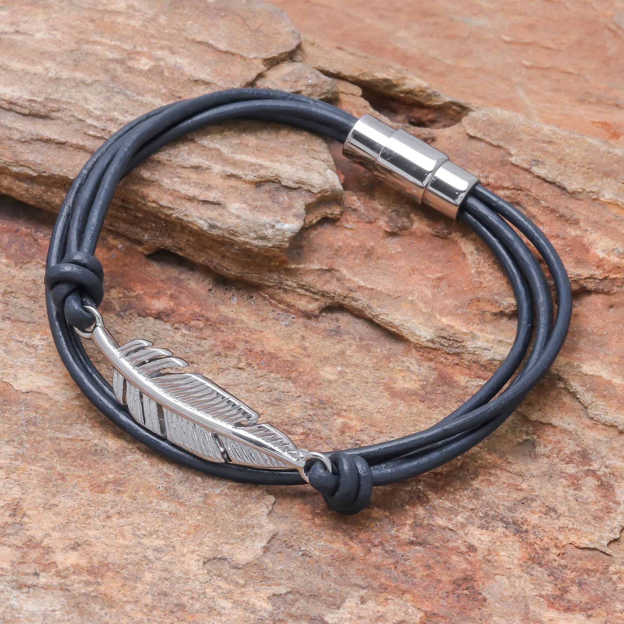 Circling the wrist with cord of navy leather, this bracelet culminates in a stunning feather pendant crafted from stainless steel. Thai artisan Passaramon designs this bracelet, which closes with a magnetic clasp.