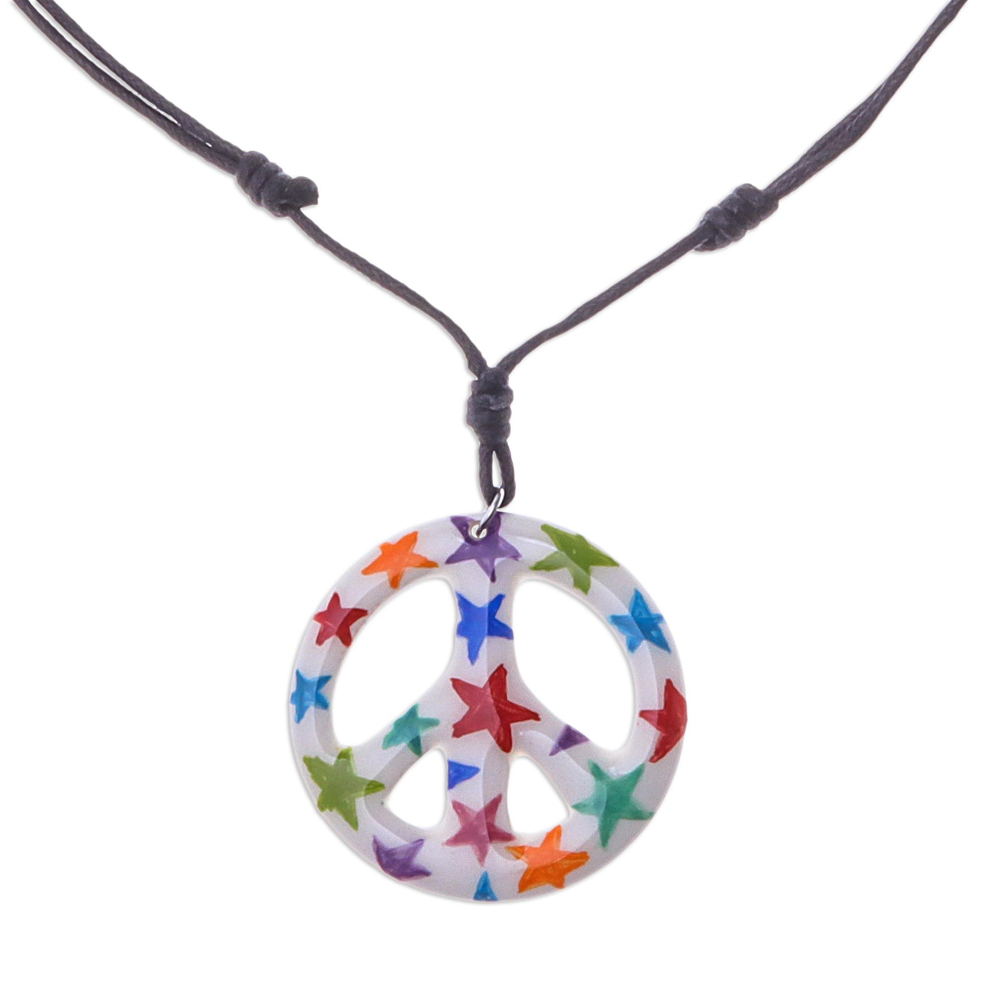 Bring a starry beauty everywhere you go with this pendant necklace from Thailand. Crafted of ceramic, the pendant takes the form of a peace symbol, painted by hand with colorful star motifs. Napat Chotpruekchookul of Thailand designs this accessory, circling the neck with adjustable cotton cord.