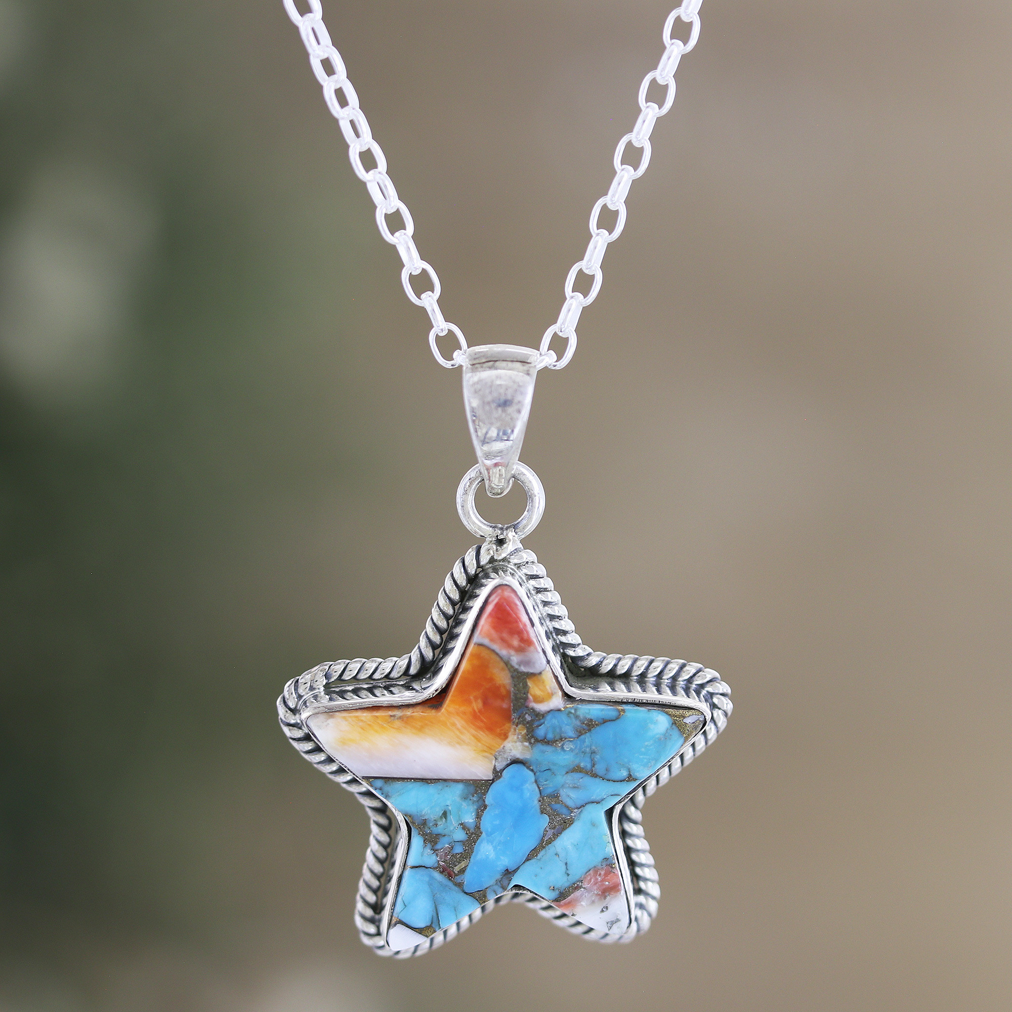 Indian artisan Bhavya Jain crafts a cheerful accessory that will shine with you on those fun outings with friends. Made from sterling silver, this pendant necklace features a star-shaped composite turquoise pendant, featuring warm and cool hues for a vivacious style.