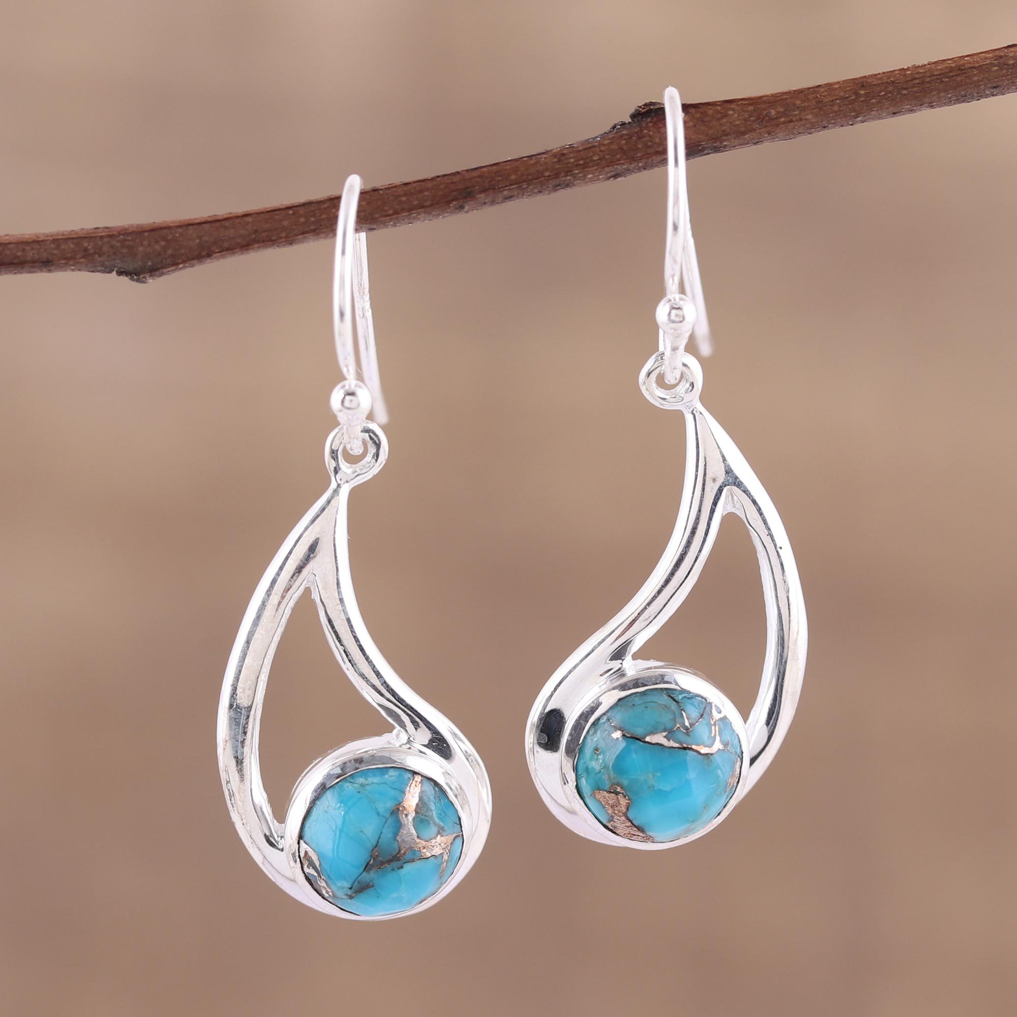 The metallic veins in composite turquoise give the stone a unique charm. Neetu Barathi uses the gemstone in a curvaceous pair of dangle earrings. The earrings are crafted from polished sterling silver and feature blue composite turquoise.