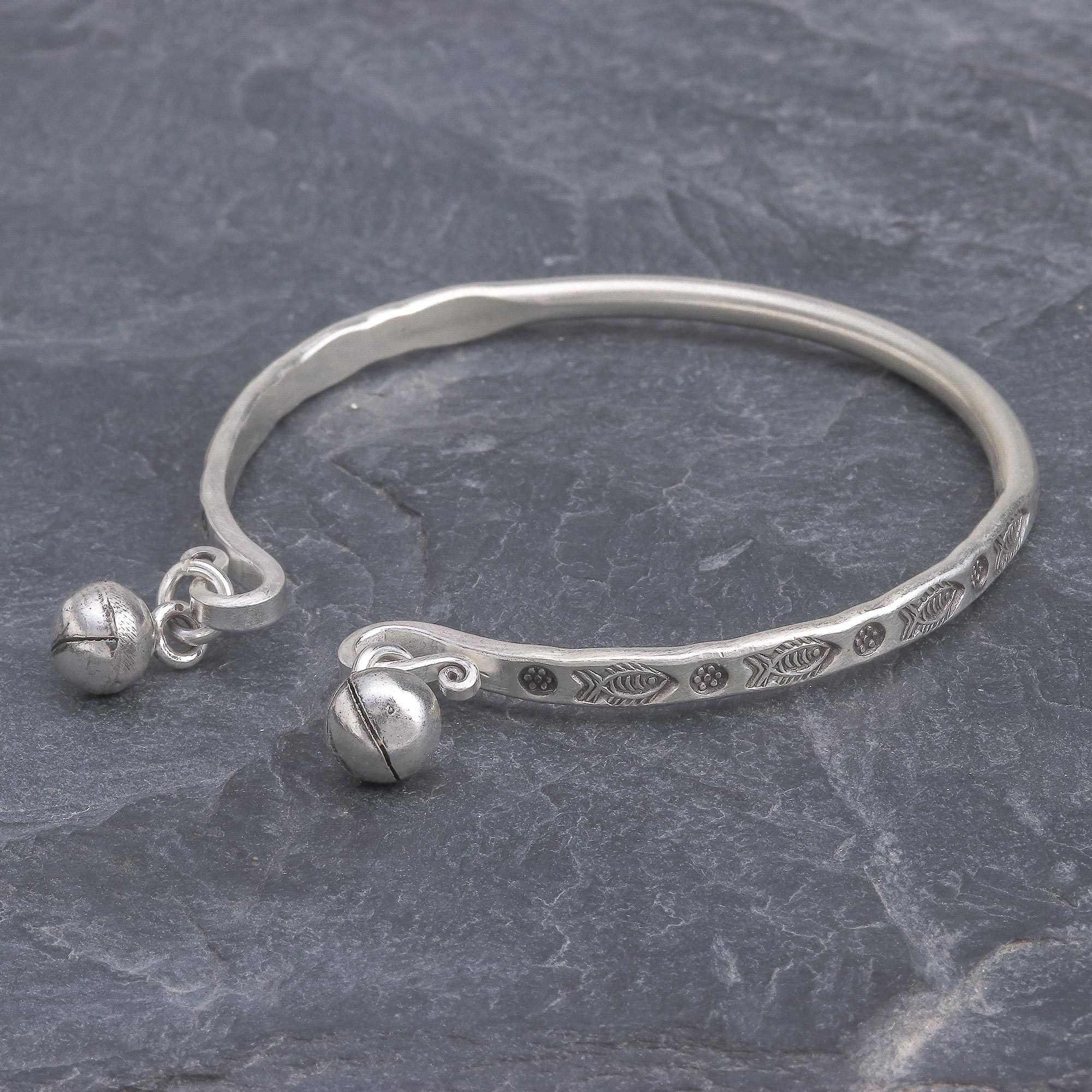 Ringing bells evoke the song of the river in this beautiful handcrafted sterling silver bracelet. From Pakaon Sojintarit, it features Karen hill tribe 950 silver bells with ornate fish and flower motifs.