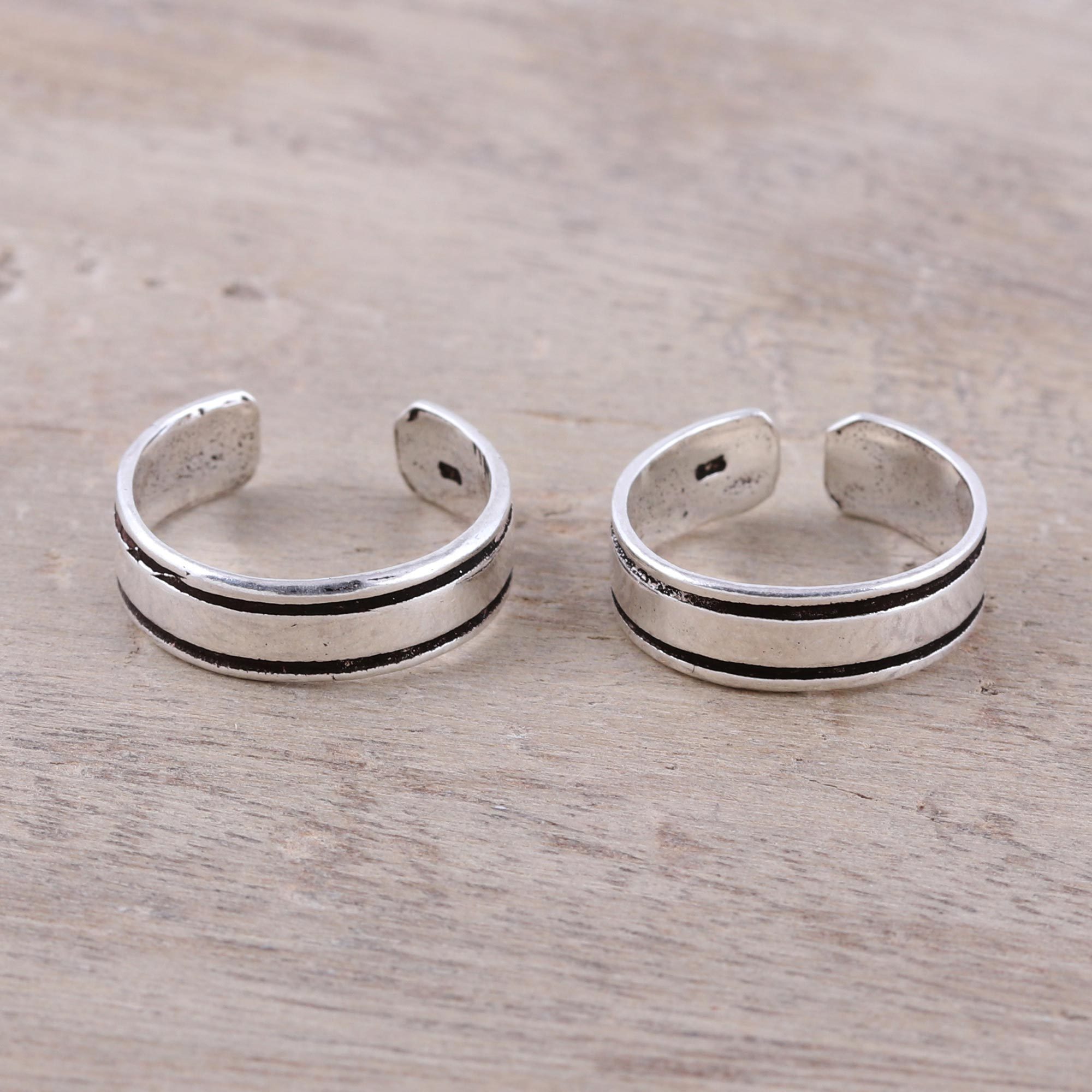 Indian artisan Bhavya Jain crafts stylish accessories for the minimalist. Two sterling silver toe rings feature a simple striped motif. This design creates a clean look when paired together. The rings are adjustable.