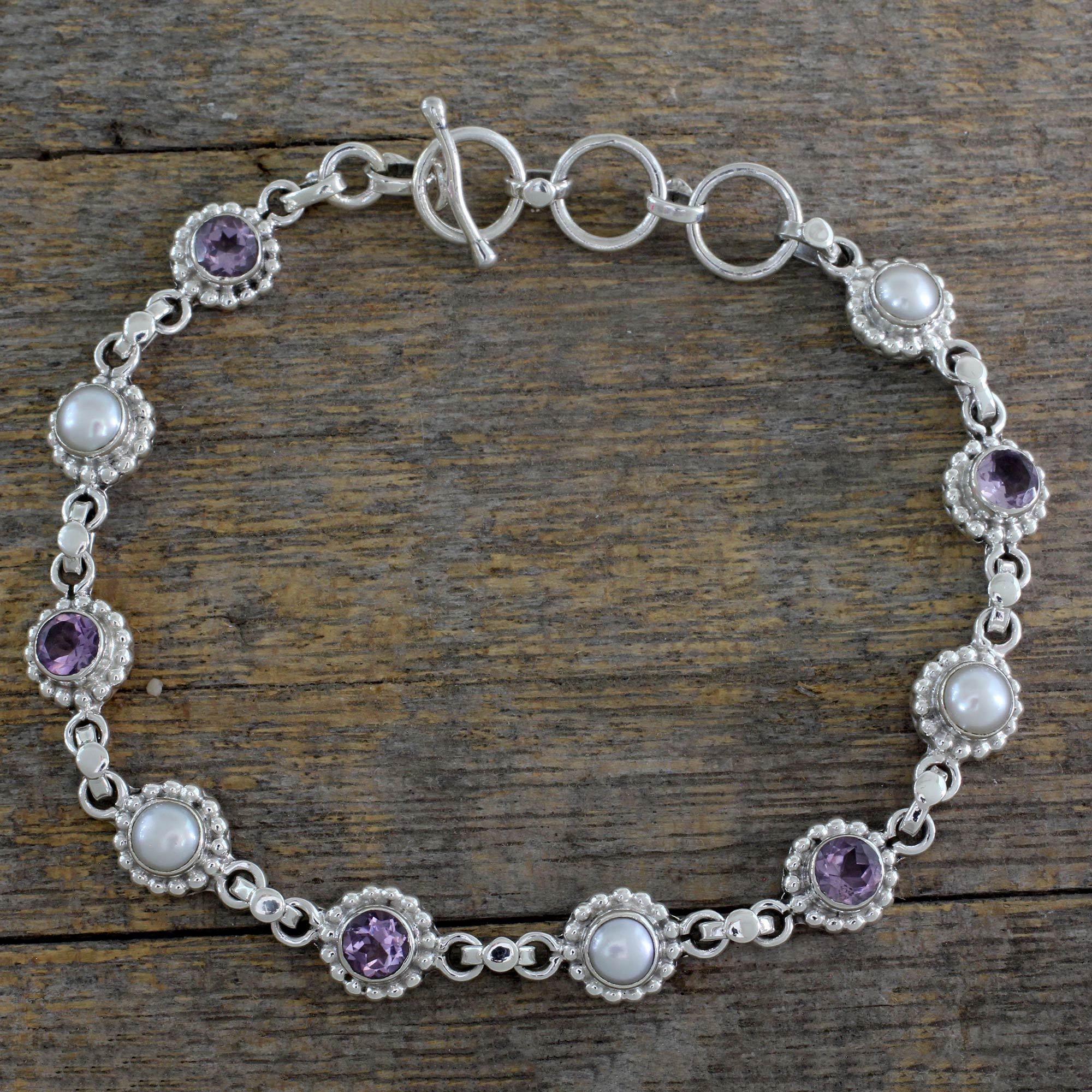 Diminutive flowers centered by gemstones align up in a lovely garland. From India's Neeru Goel, this sterling silver bracelet is delightfully feminine. The handcrafted design showcases amethysts that total 2.5 carats and creamy cultured pearls.
