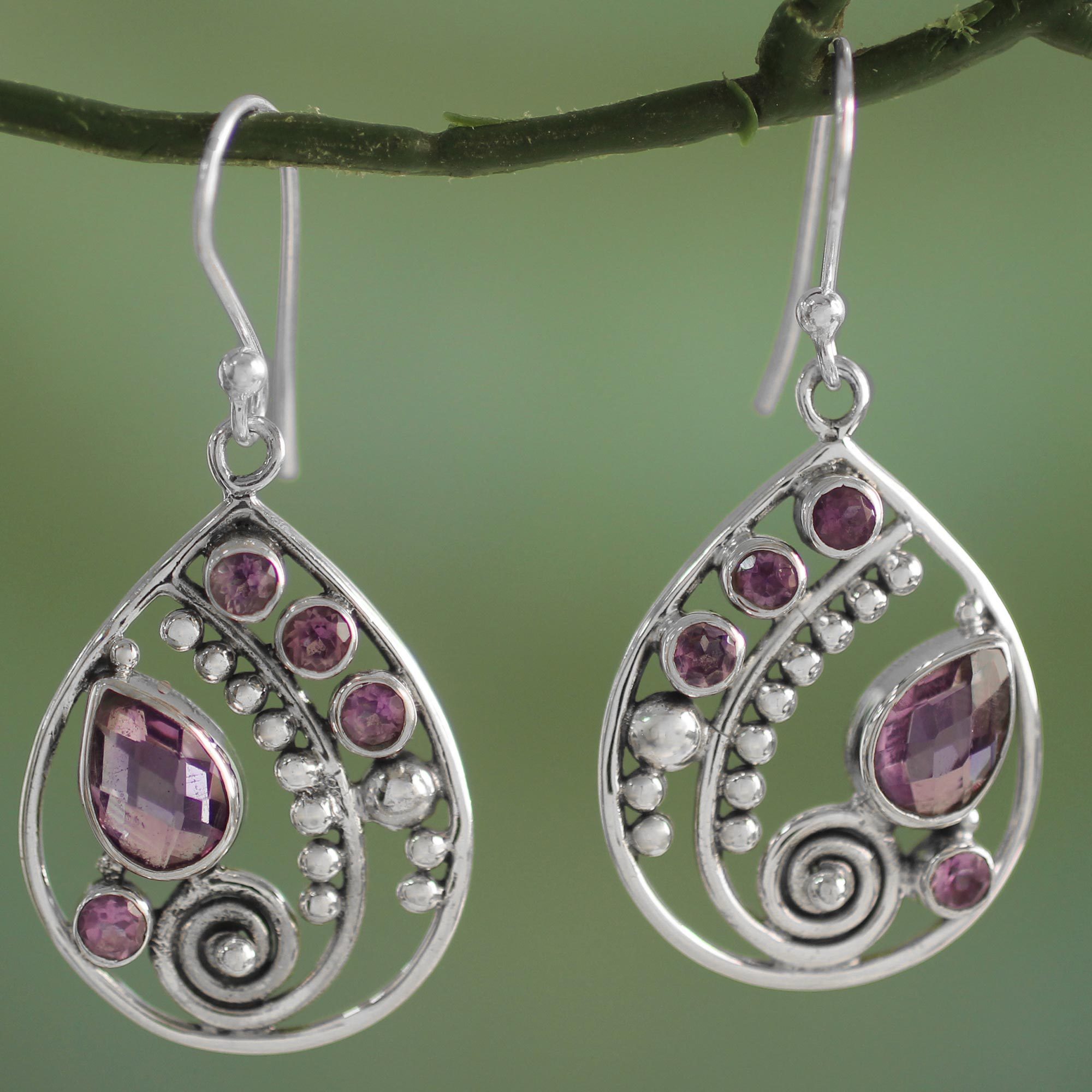 Hand crafted from sterling silver and tear-drop amethyst stones by Indian artist Shanker using silver crafting techniques unique to India, these earrings mimic radiant stalks of grass glistening bright with dew. Framed by silver tendrils with a slightly darker finish, three carats of amethyst shine brightly, lending this pair a complexity that is sure to be noticed.