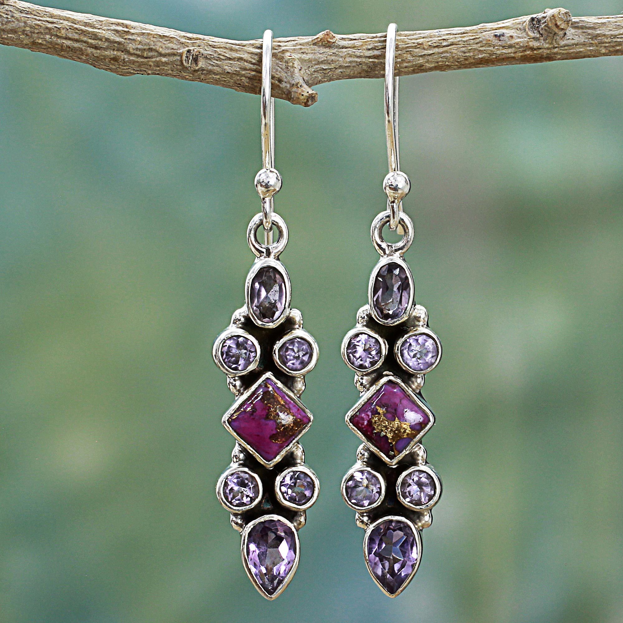 Featuring over two carats of amethyst alongside composite turquoise, these dangle earring are beautiful and regal. Indian artisan Neeru Goel hand crafts these earrings, framing the stones with sterling silver.