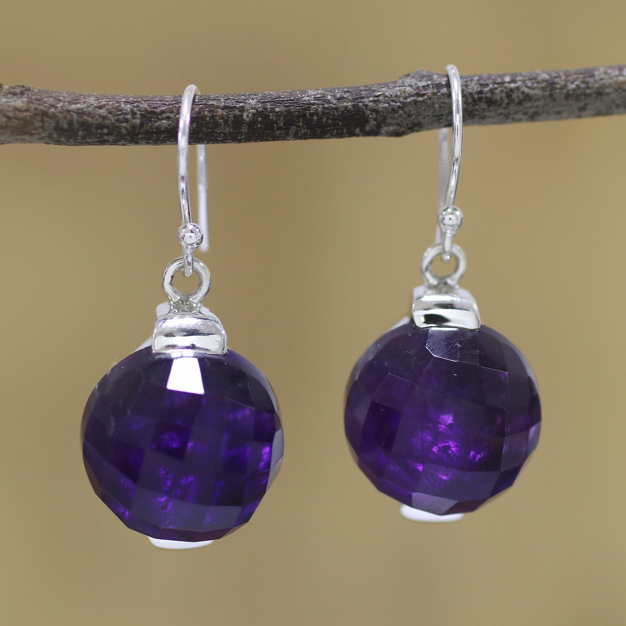 Sterling Silver Amethyst Orb Dangle Earrings from India, 'Dazzling Orbs'