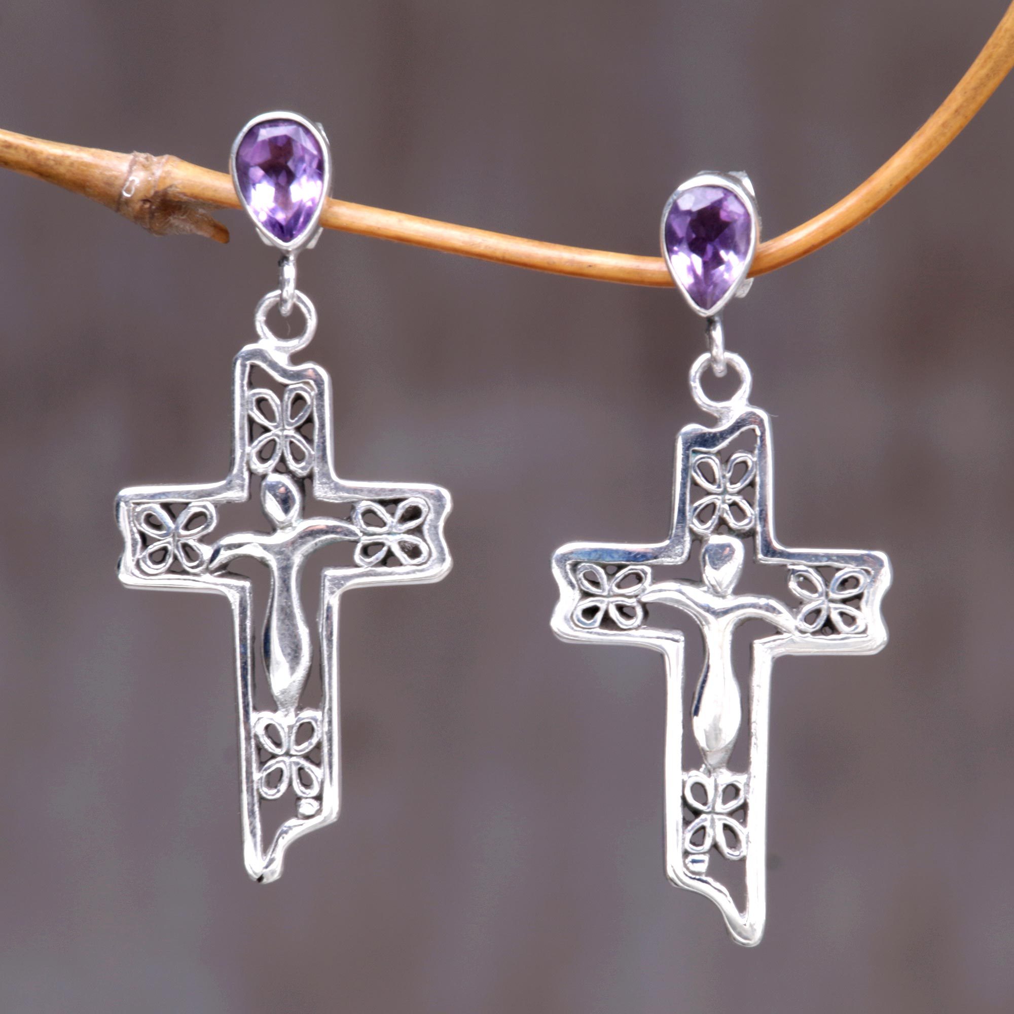 Sterling Silver Amethyst Religious Earrings, 'Floral Cross'