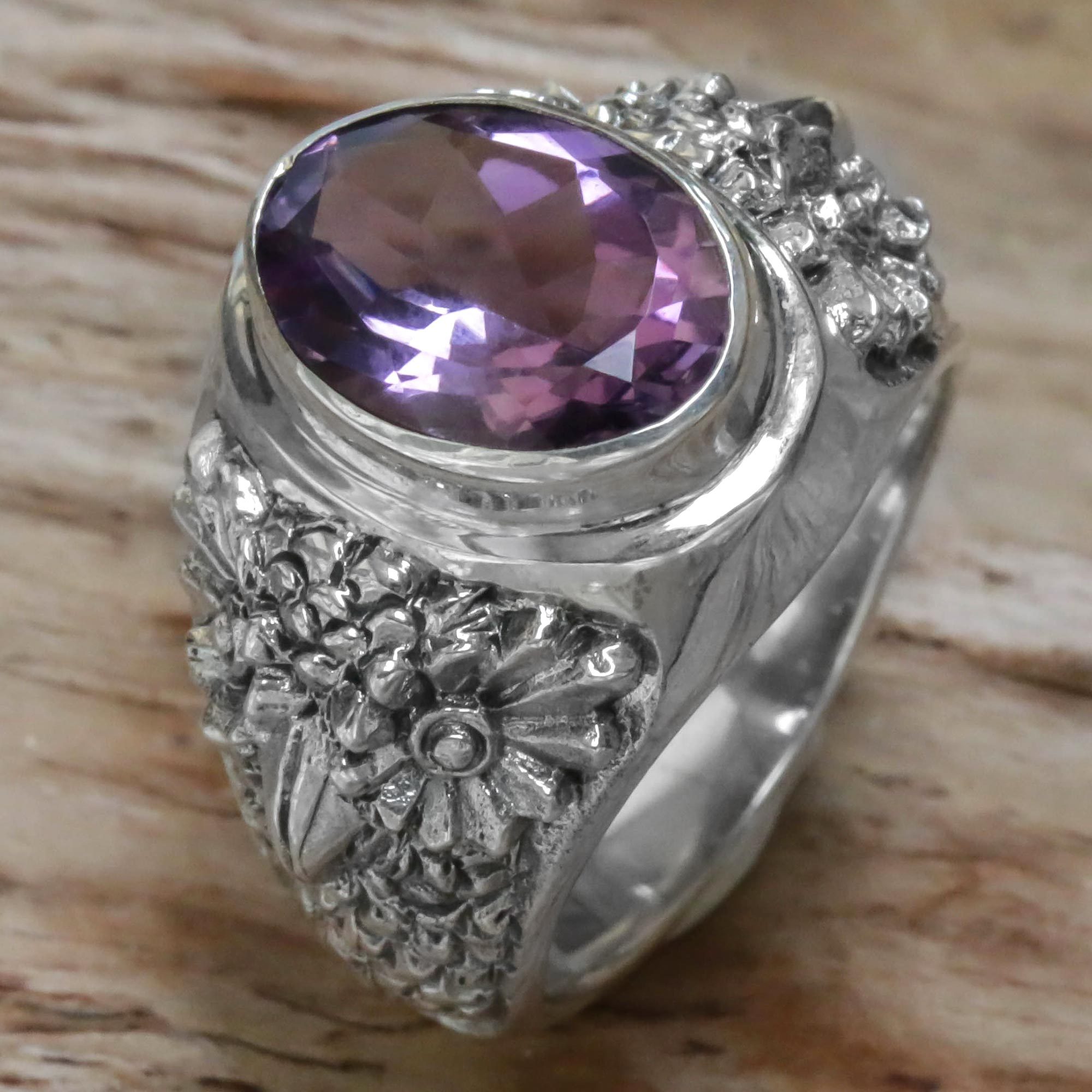 A three-carat amethyst sparkles with purple hues atop this single-stone ring by Indonesian artisan Nyoman Rena. He designs it with sterling silver, depicting the faces of wide-eyed owls on the band.