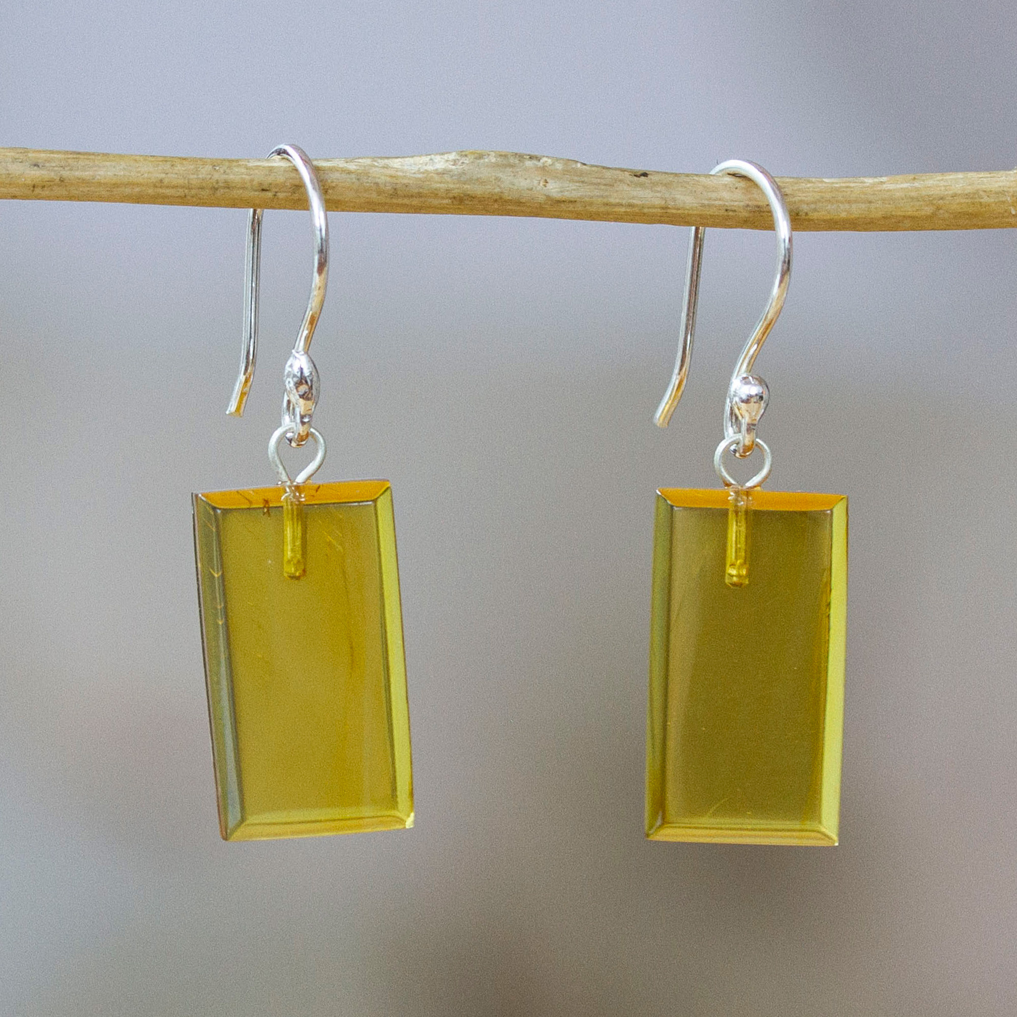 This contemporary take on amber jewelry featuring solid bars of amber treasure comes from Juan García of Mexico. The variety and unpredictability of natural amber, presented here in a faceted baguette shape, contrasts with the modern, geometric lines of the sterling silver. Sterling silver hooks complete these dangle earrings.
