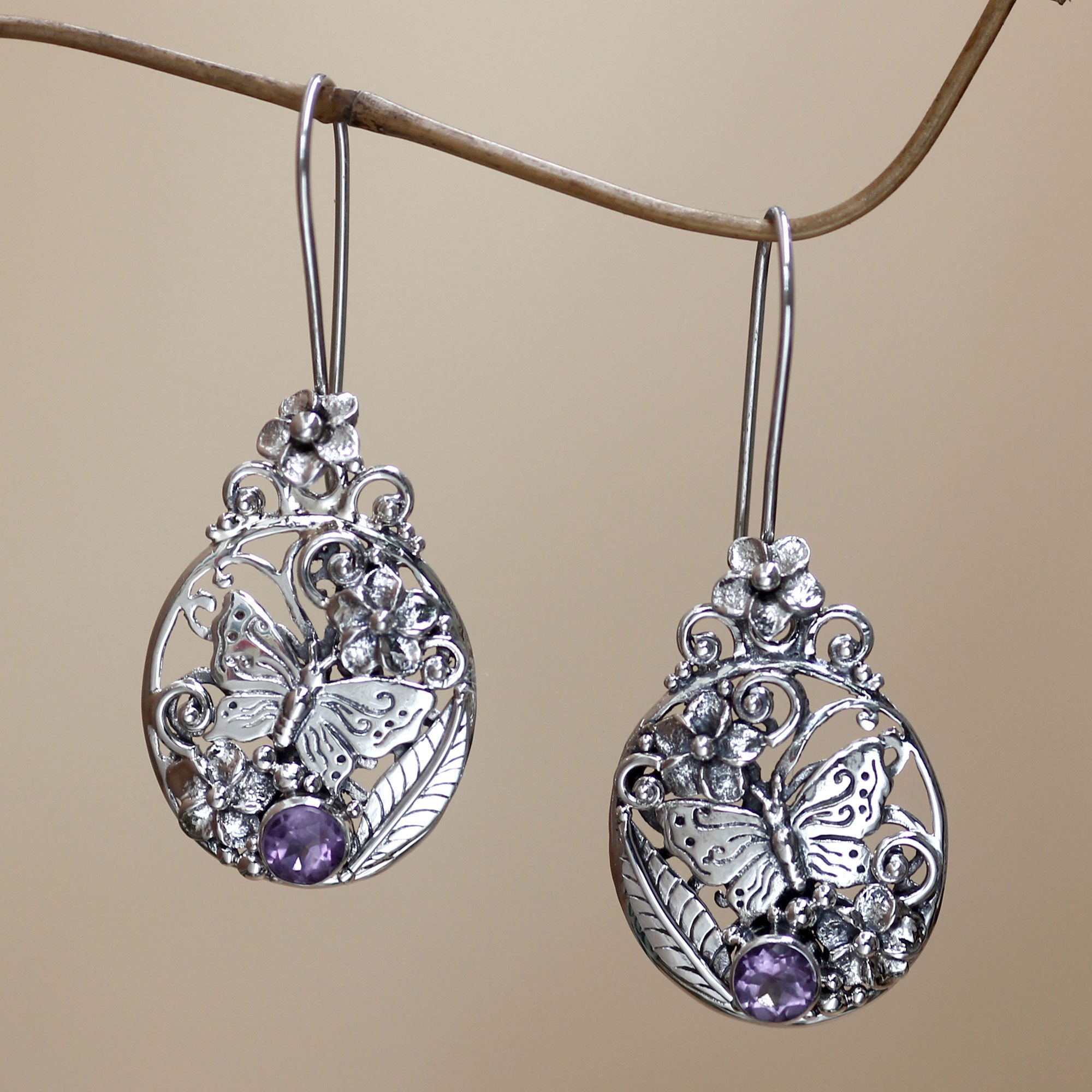 Regal spring is captured in these fanciful amethyst and sterling silver butterfly earrings from Bali and Java. Created by Buana from Indonesia, a detailed butterfly design is cut into a button shape disc and accented with delicate frangipani flowers. This exquisite pair celebrates natural wonders.