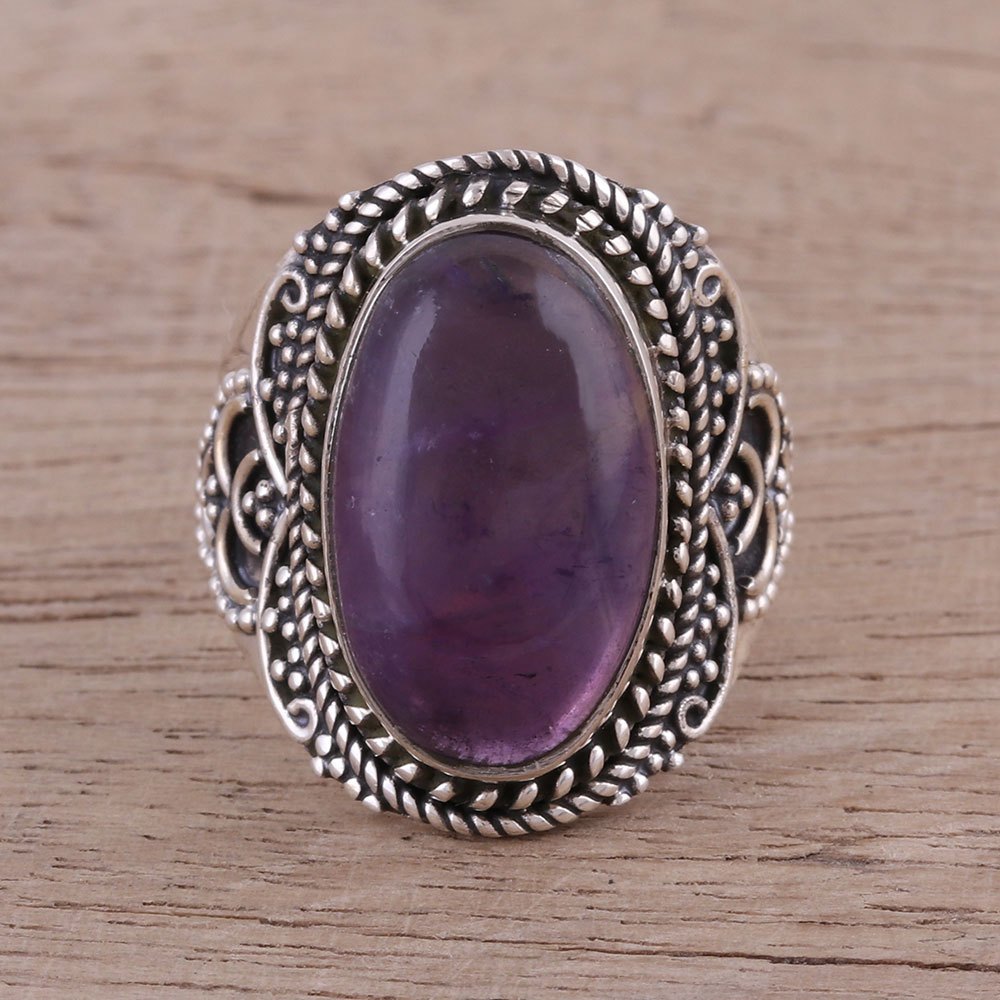 Swags of sterling silver wire create bold contrast against a darkly oxidized background on this cocktail ring from Alok Jain. The silver cascades flank a cabochon of luminous amethyst set within a polished bezel. Artisans craft the ring by hand from sterling silver.