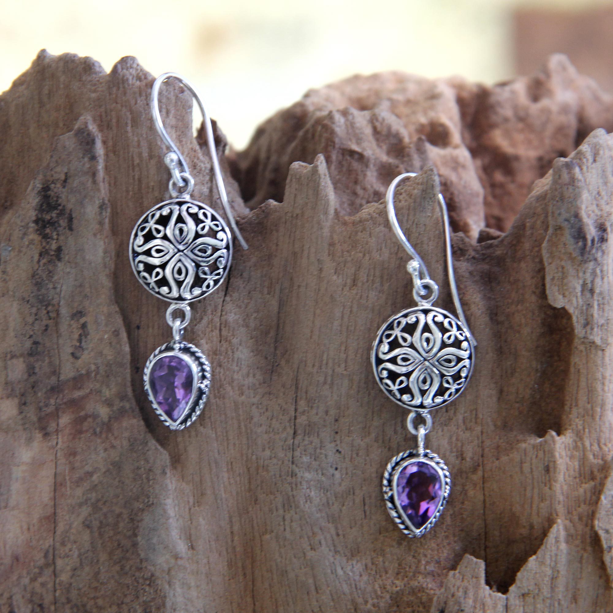 Sterling Silver and Amethyst Dangle Earrings, 'Kintamani'