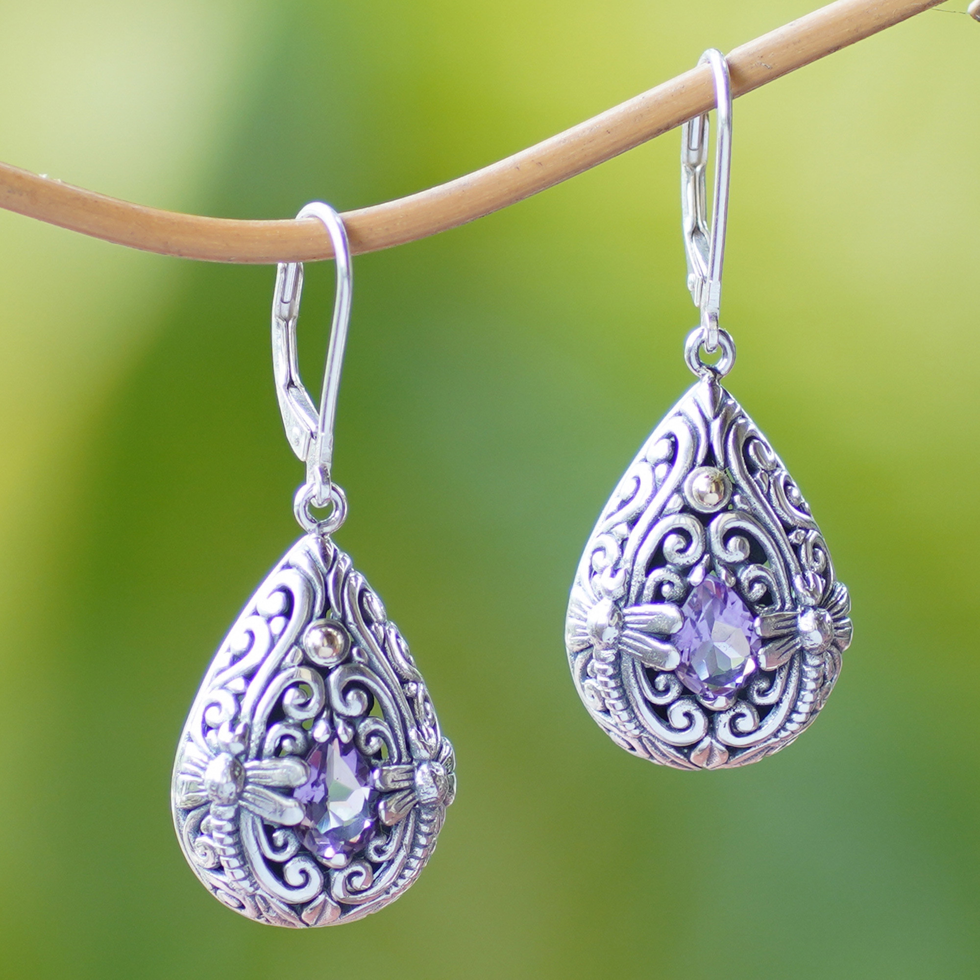 These sterling silver and amethyst dangle earrings designed by Balinese artisan Wayan Neri feature floral motifs and twin dragonfly adornments. Pear-shaped amethyst gems and 18k gold plated accents add a touch of glitz to the intricate silver work designed by Neri and her husband.