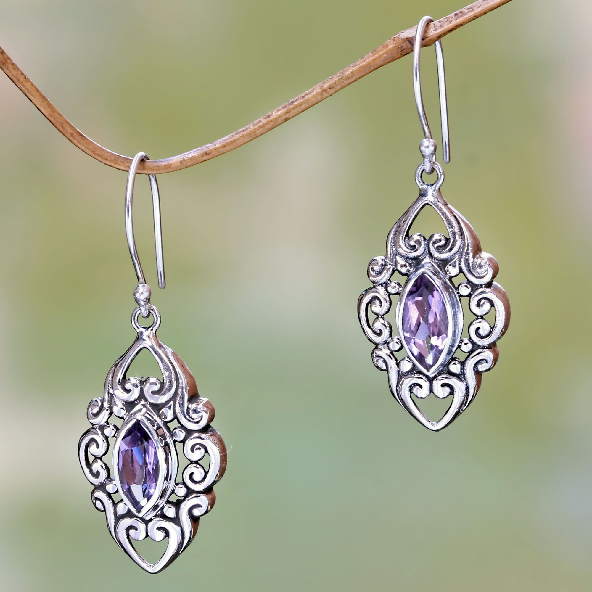 Ornate curls and flourishes call to mind the glory of ancient heraldry. Bali artisan Komang Wijayana creates the elegant earrings of sterling silver and crowns them with marquise-cut amethysts.
