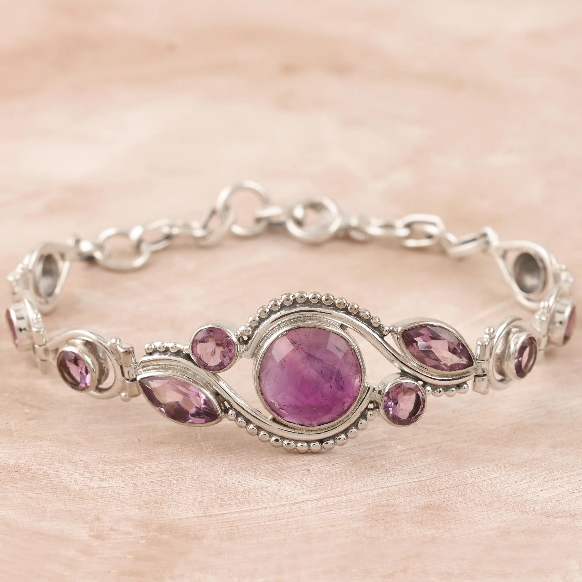 Presented by Neeru Goel, this regal bracelet features rich purple gemstones and an elegant design. Indian artisans center the bracelet with a smooth amethyst, surrounding the large gem with petite amethyst stones in bezel settings. Sterling silver accents shine next to the pretty gemstones.