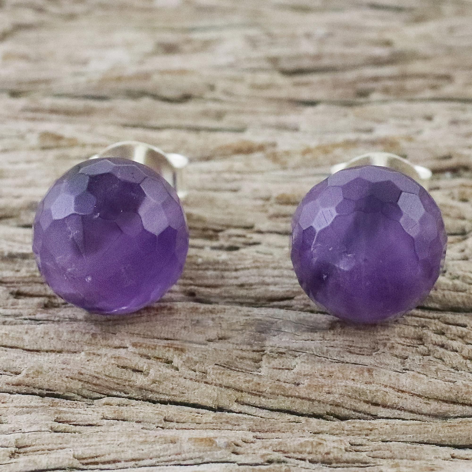 Two faceted orbs of amethyst sparkle with purple hues in this pair of stud earrings, designed and crafted by Somluck Komolmith of Thailand. She uses nine carats of amethyst stones, setting them on sterling silver posts.