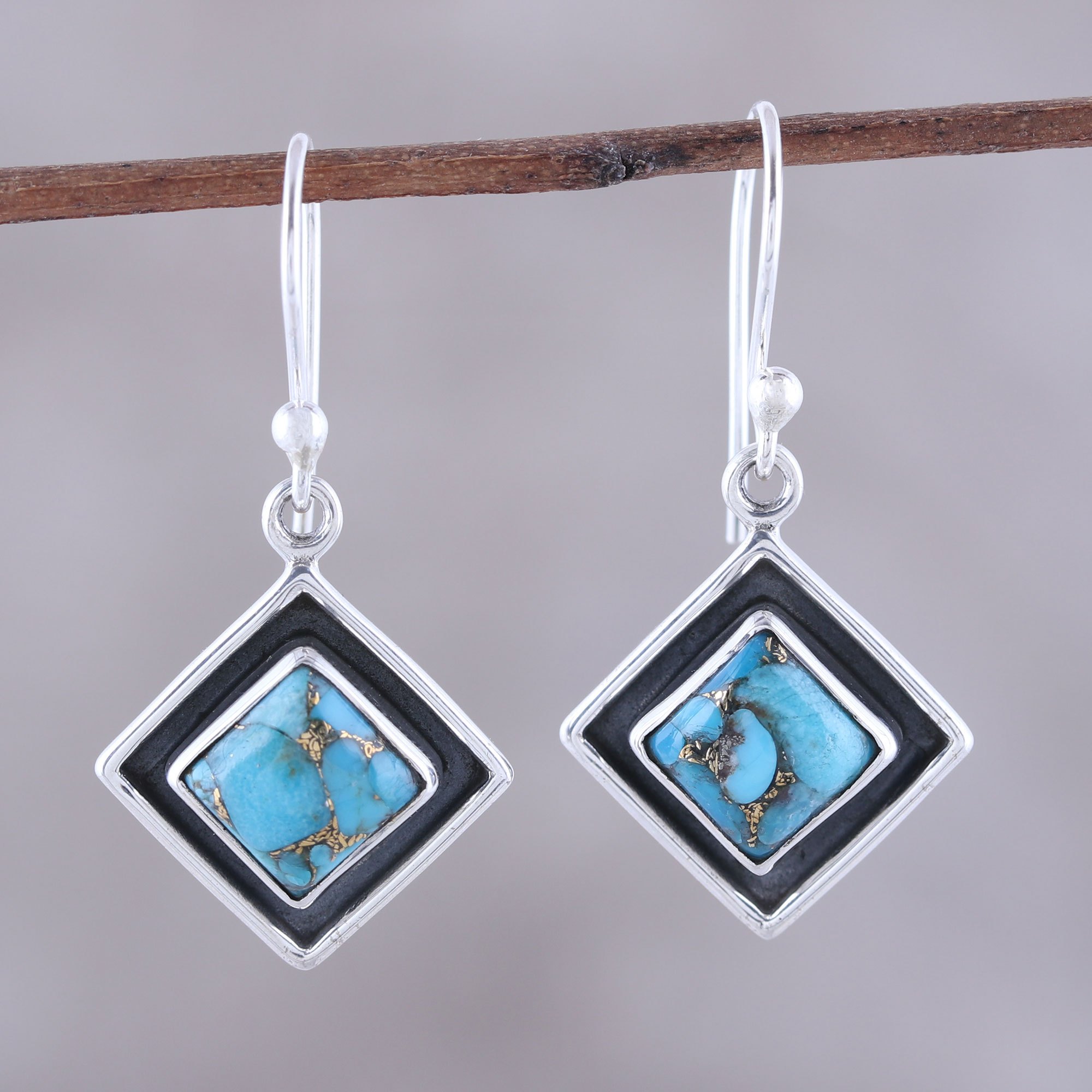 Presented by Shanker, these Indian earrings resemble chic kites that dangle from the ears. Each square earring is crafted of sterling silver with a combination of finishes. A piece of blue composite turquoise gleaming with golden veins centers each earring.