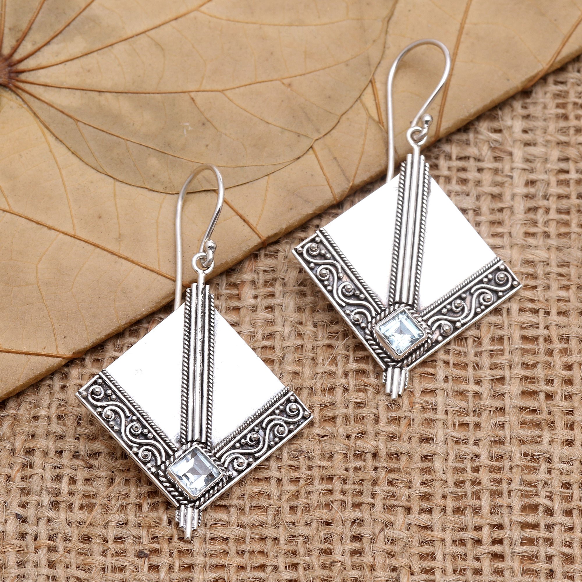 With their diamond-shaped panels of gleaming silver, Made Mustika's dangle earrings are truly unique. The Balinese artisan bisects the panel with three sterling silver rods, which lead to a square blue topaz stone in a bezel setting. A decorative engraving borders the bottom edges of the earrings, while sterling silver hooks finish the exquisite pair.