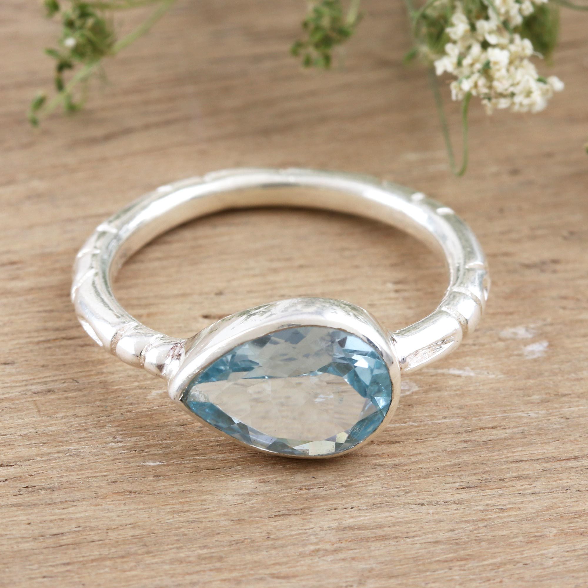 A translucent blue teardrop sparkles at the center of Neetu Barathi's lovely ring. The Indian artisan crafts the ring's band from notched sterling silver, topping the piece with a faceted blue topaz gemstone in a bezel setting.