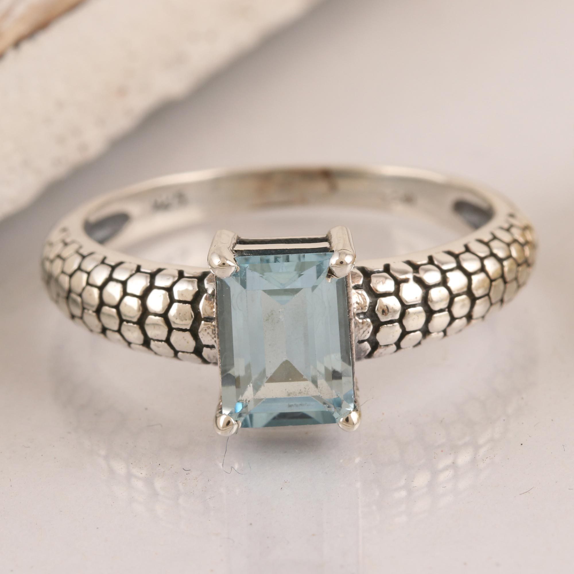 Capture the demure charm of blue topaz with Chintan's delicate solitaire ring. Indian artisans center the ring with a faceted, rectangular blue topaz gem in a decorative prong setting. The sterling silver band boasts a snake skin texture with beautiful oxidized details.
