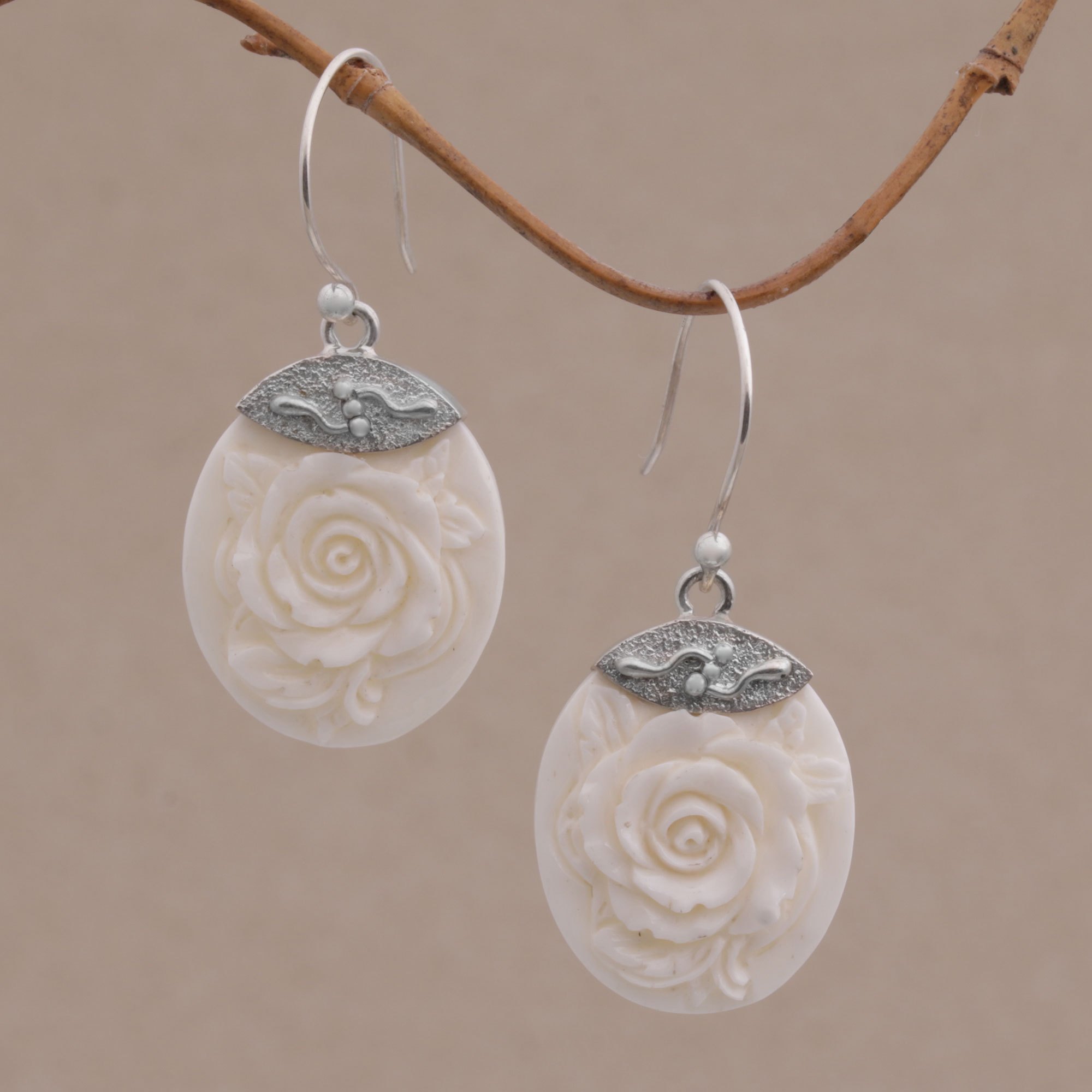 Hand-carved from bone, two beautiful roses are depicted in this pair of earrings from Bali. Made Wardika designs the earrings, dangling the roses from sterling silver hooks.