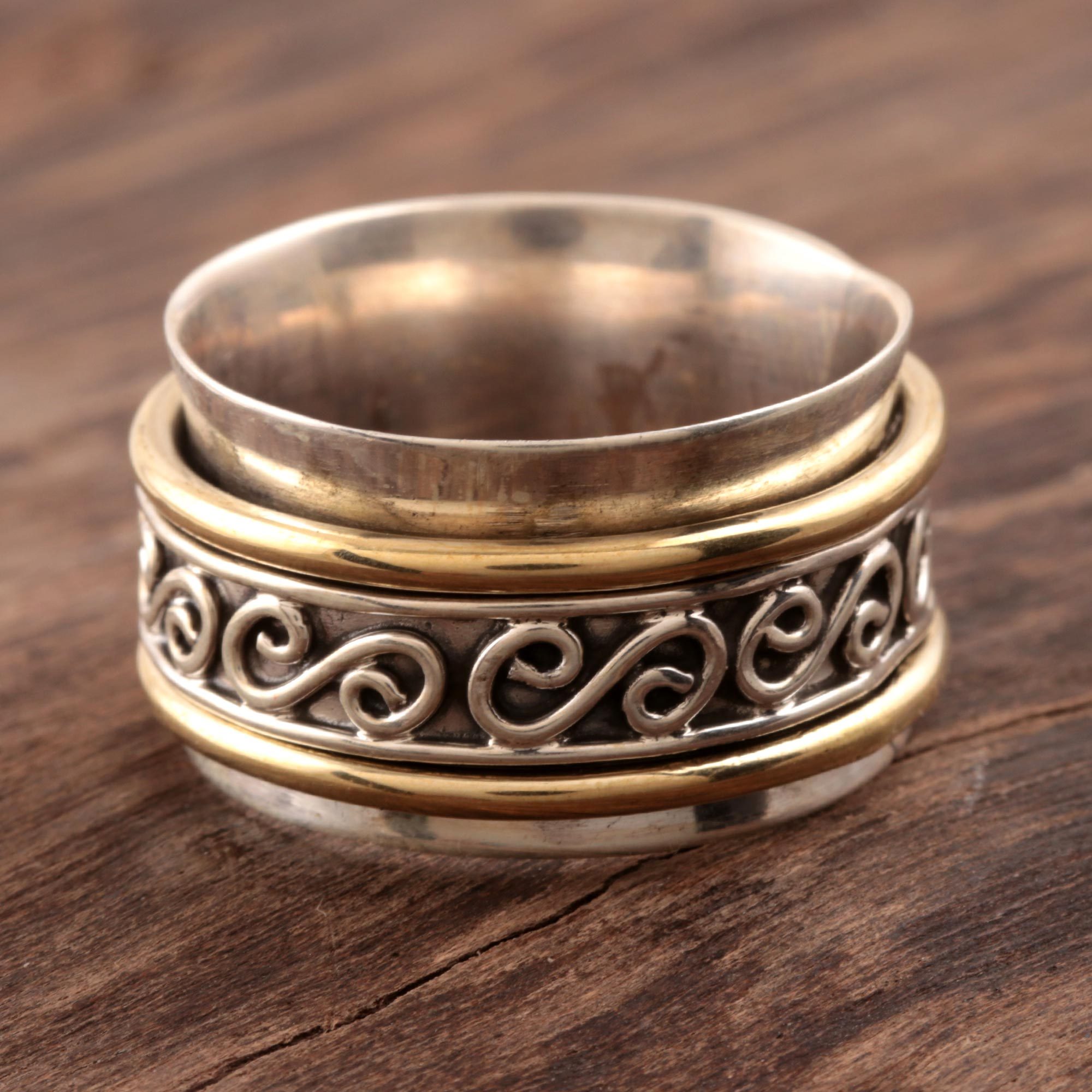 Sterling Silver and Brass Spinner Ring from India, 'Happy Swirls'