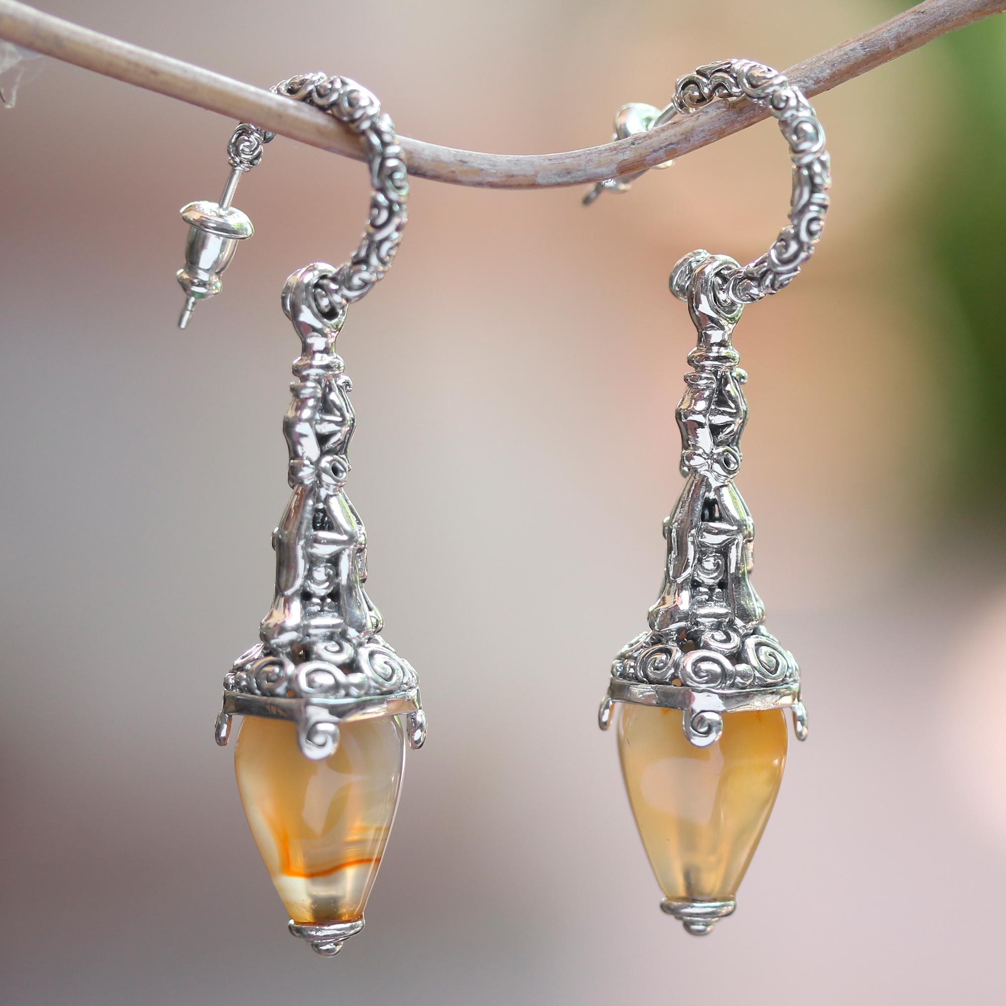 Carnelian's fiery glow suggests light from temple lanterns in this design by Zayd Makarim. The Javanese artisan works in sterling silver to create the original earrings, with motifs known as Buddha's curls that reflect the designer's own deep faith.